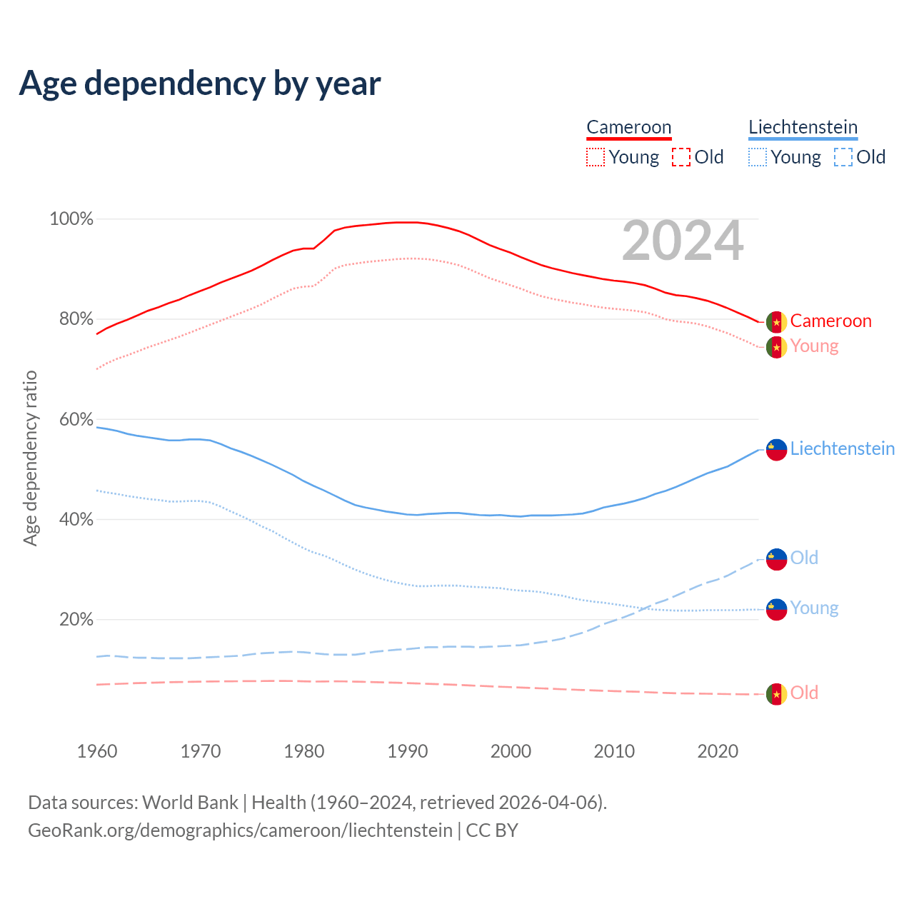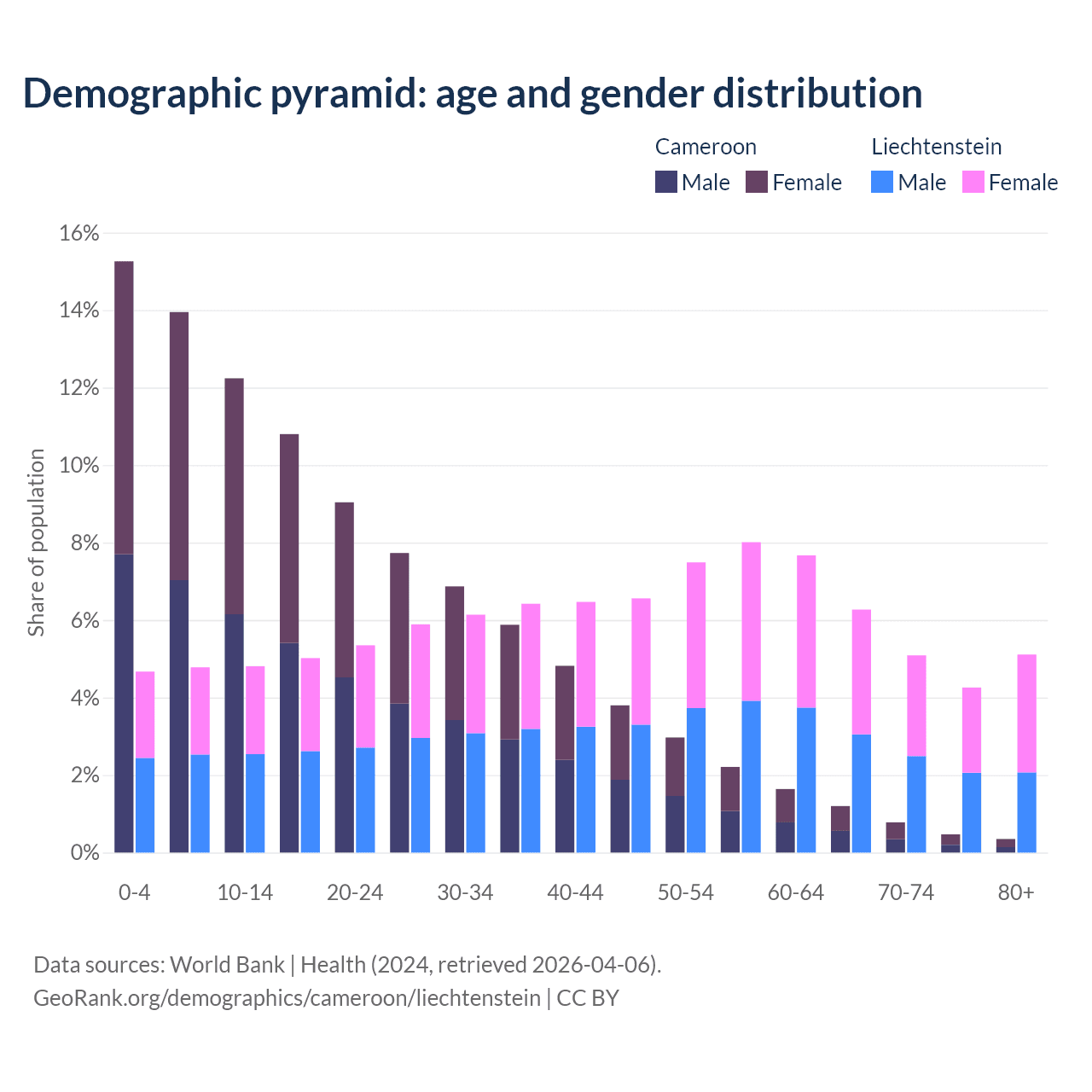- The share of old-age demographic (65+) in Cameroon is 2.79% vs 20.7% in Liechtenstein.