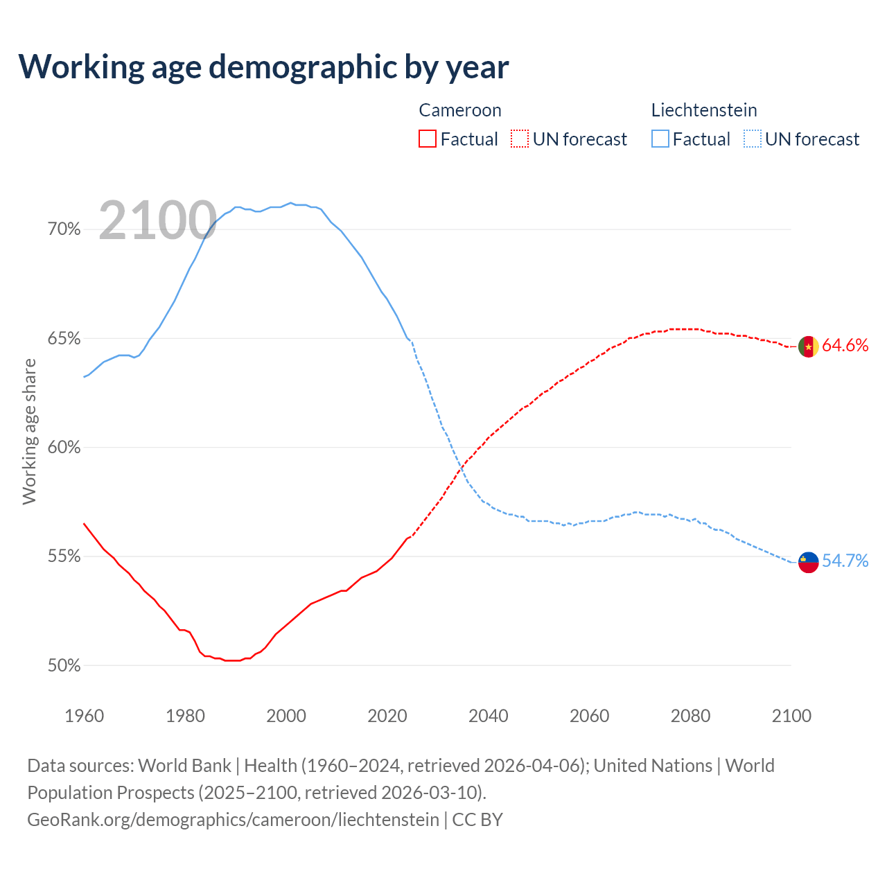The share of older people aged 65 and over is 2.79% in Cameroon and 20.7% in Liechtenstein. Life expectancy in Cameroon compared to Liechtenstein .