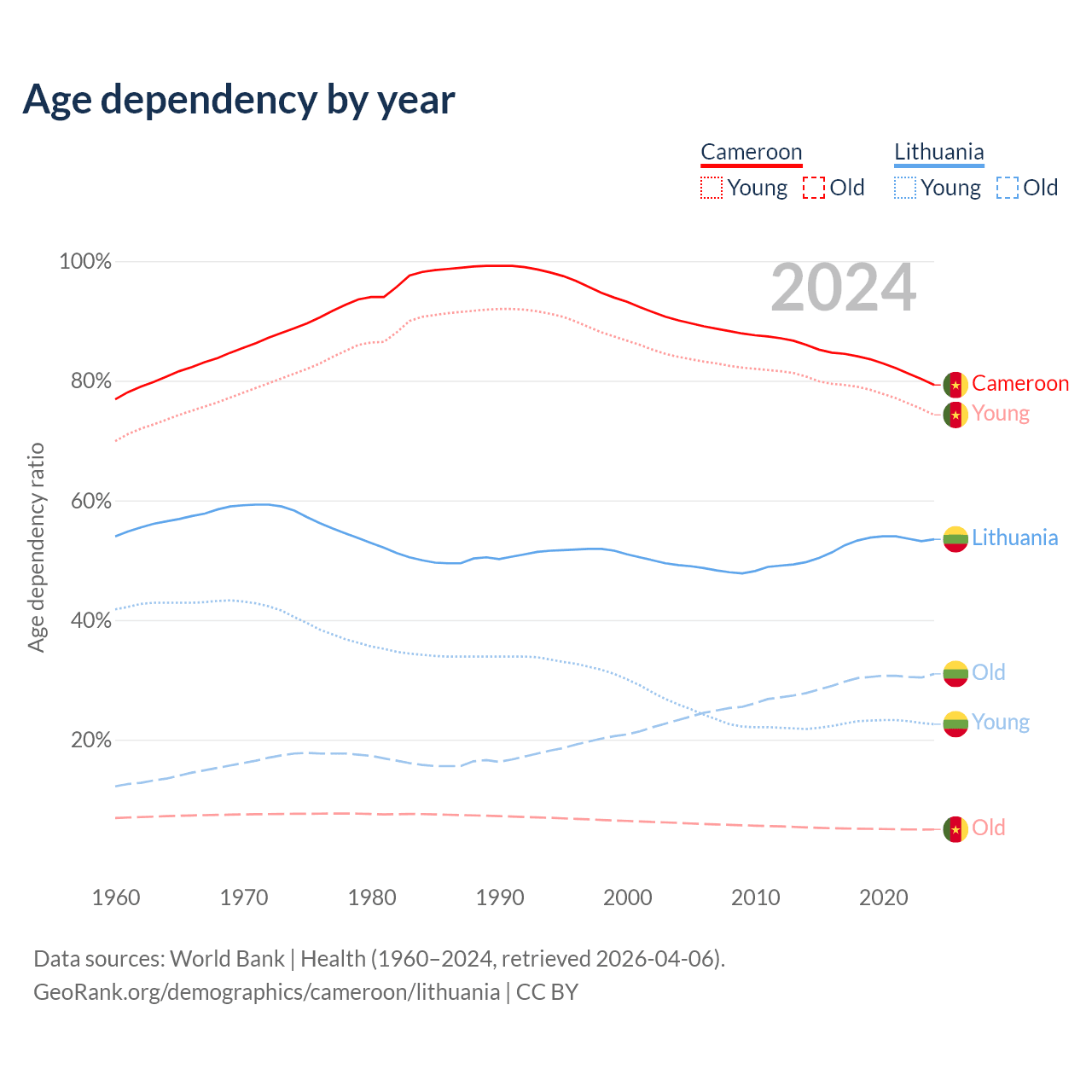 The share of older people aged 65 and over is 2.79% in Cameroon and 20.2% in Lithuania. Life expectancy in Cameroon compared to Lithuania .