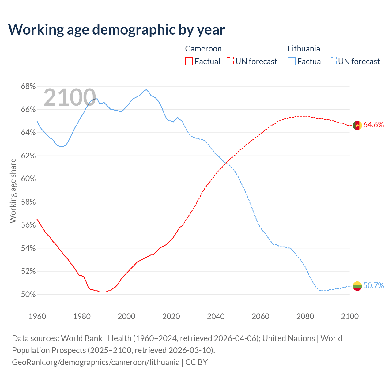 Median age Cameroon vs Lithuania, 1960-2100