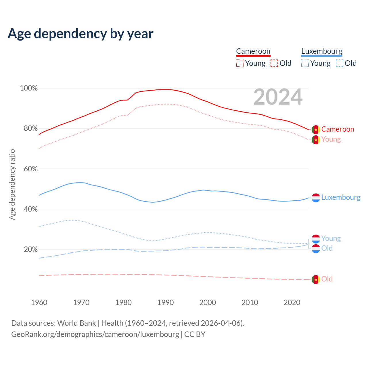 The share of older people aged 65 and over is 2.79% in Cameroon and 15.5% in Luxembourg. Life expectancy in Cameroon compared to Luxembourg .