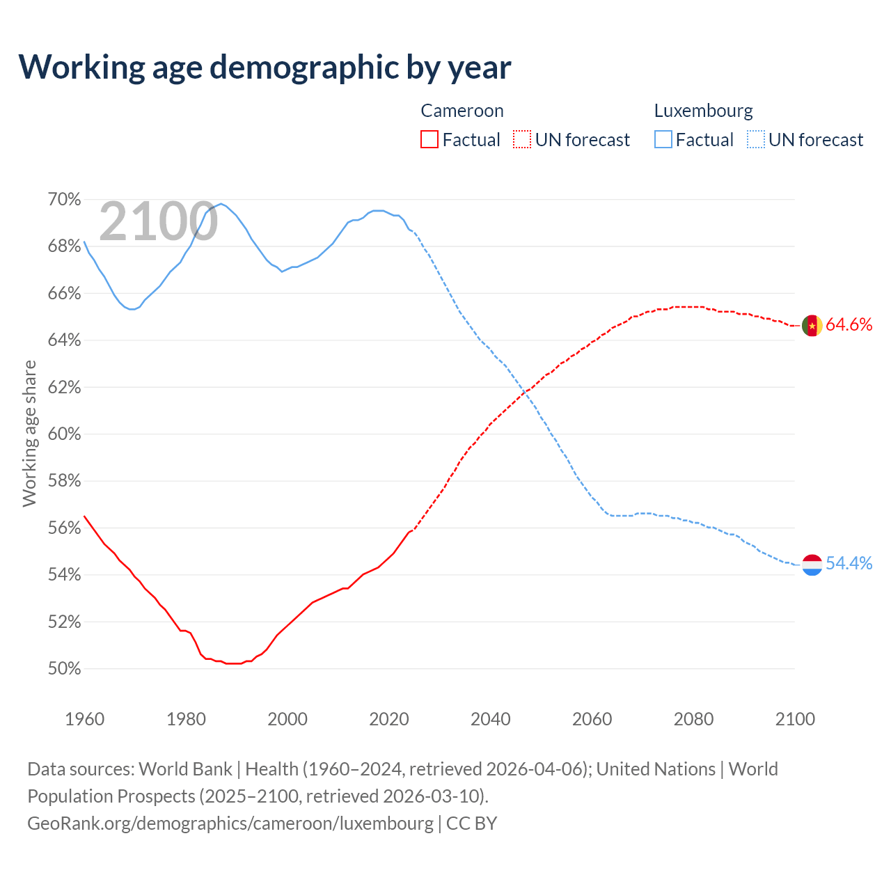 - Cameroon has 17.2M working age adults (aged 15-64) vs 477K in Luxembourg.
