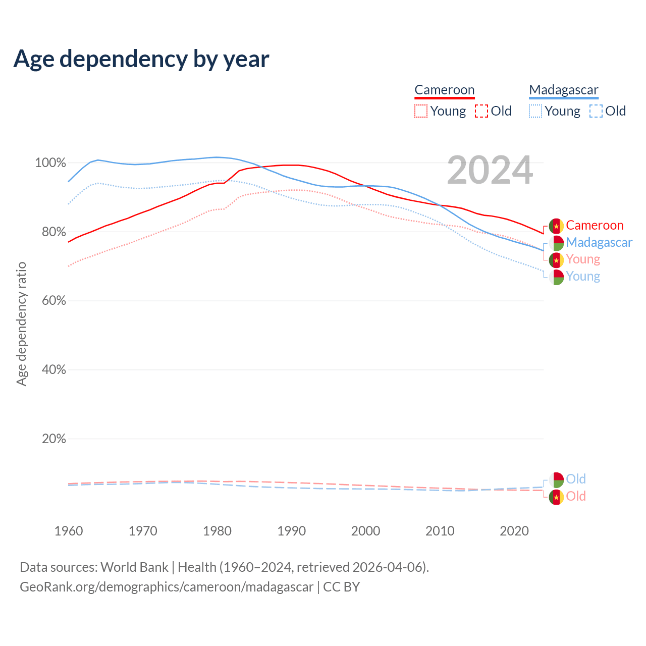 The share of older people aged 65 and over is 2.79% in Cameroon and 3.41% in Madagascar. Life expectancy in Cameroon compared to Madagascar .