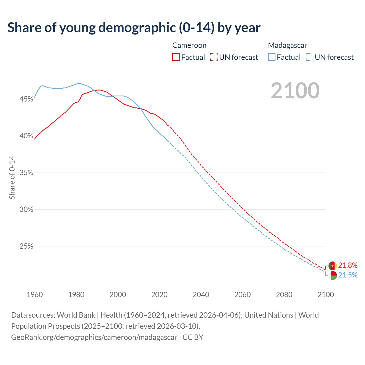 - The share of young demographic (0-15 years old) in Cameroon is 41.4% vs 39.3% in Madagascar.