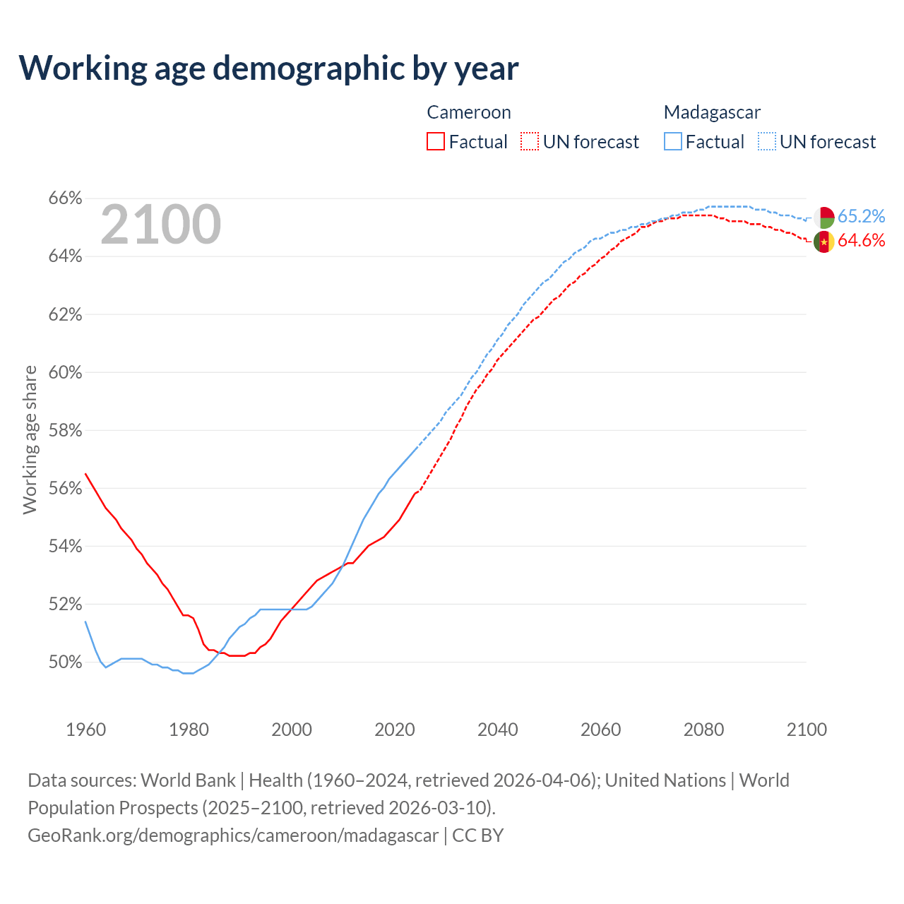 - Cameroon has 17.2M working age adults (aged 15-64) vs 19.4M in Madagascar.
