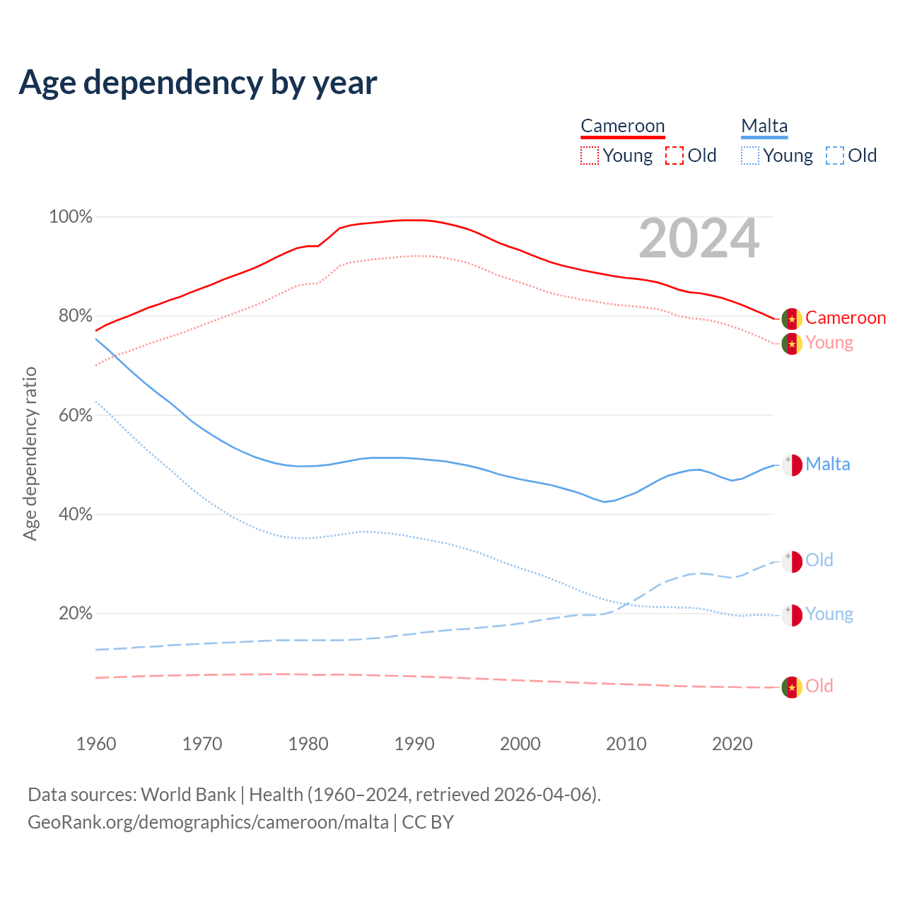 - The share of old-age demographic (65+) in Cameroon is 2.79% vs 20.2% in Malta.