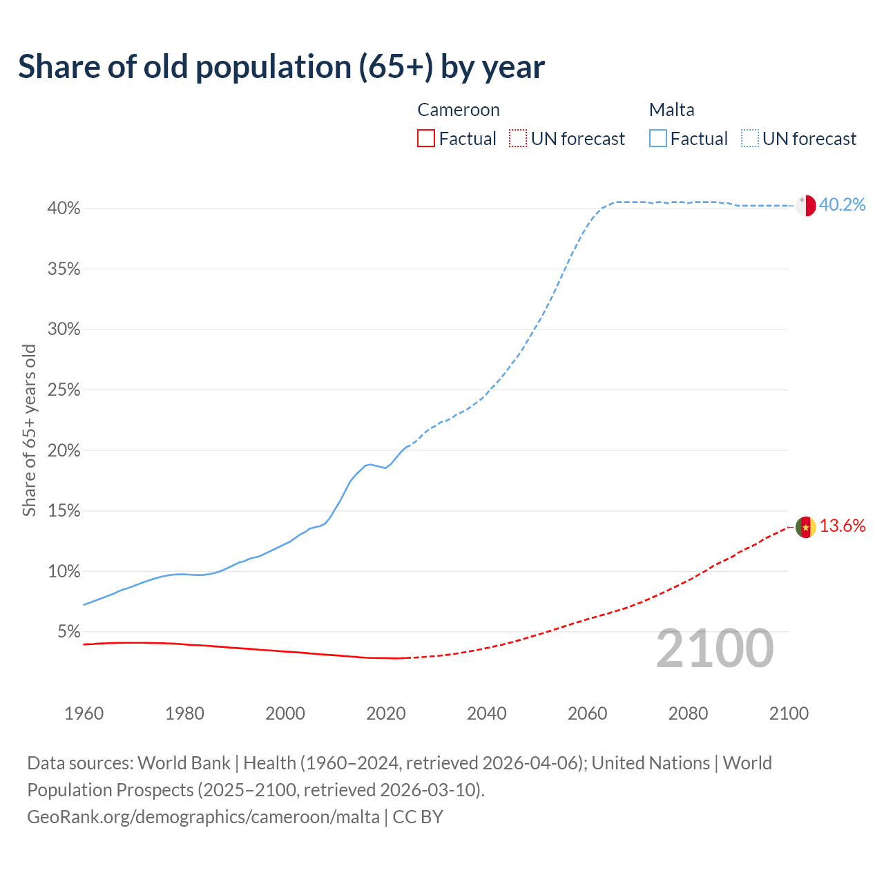 The share of older people aged 65 and over is 2.79% in Cameroon and 20.2% in Malta. Life expectancy in Cameroon compared to Malta .