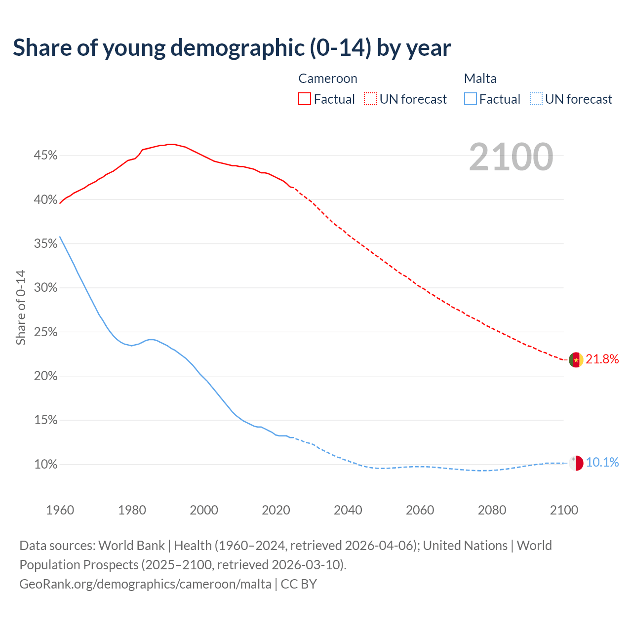 - The share of young demographic (0-15 years old) in Cameroon is 41.4% vs 13% in Malta.
