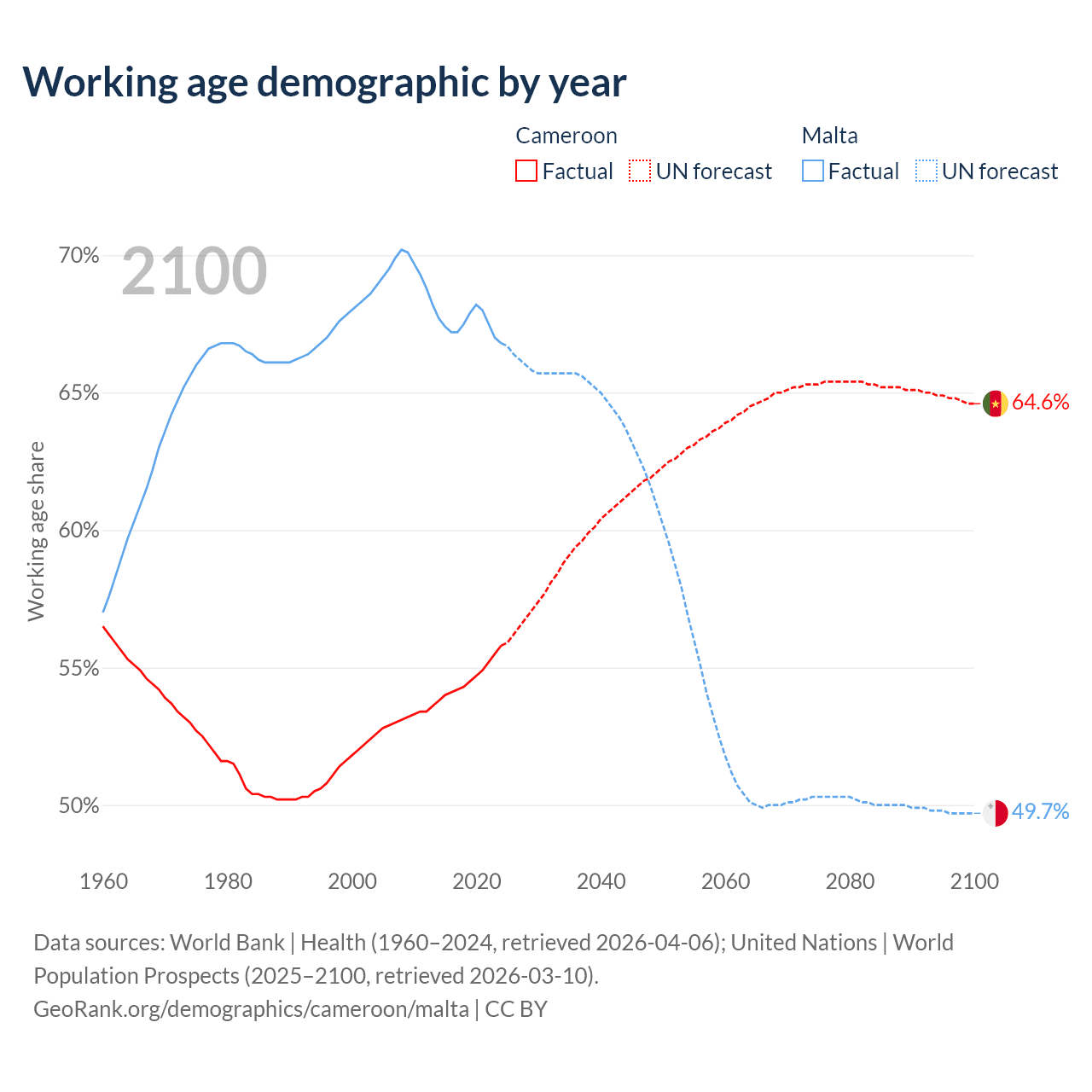 - Cameroon has 17.2M working age adults (aged 15-64) vs 388K in Malta.
