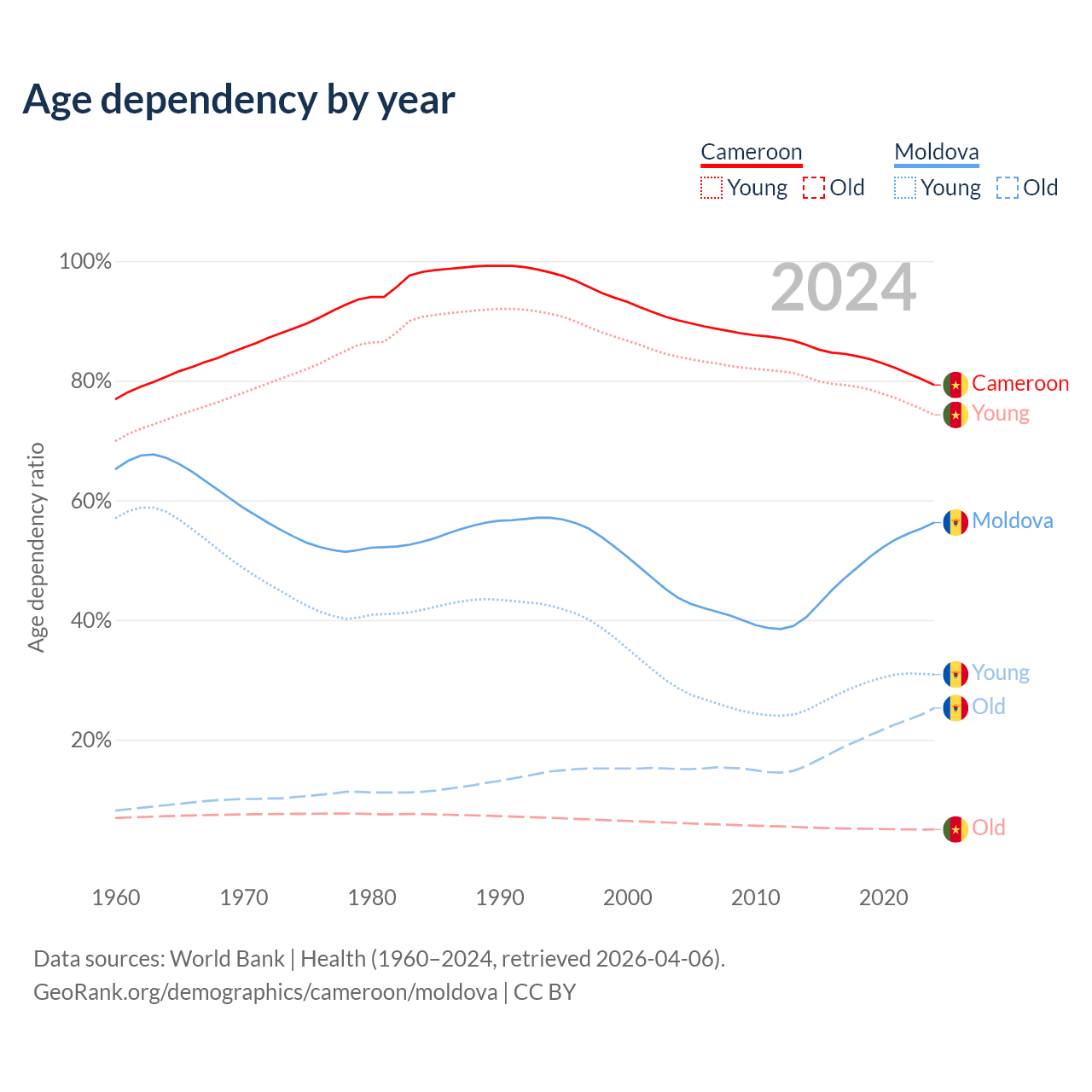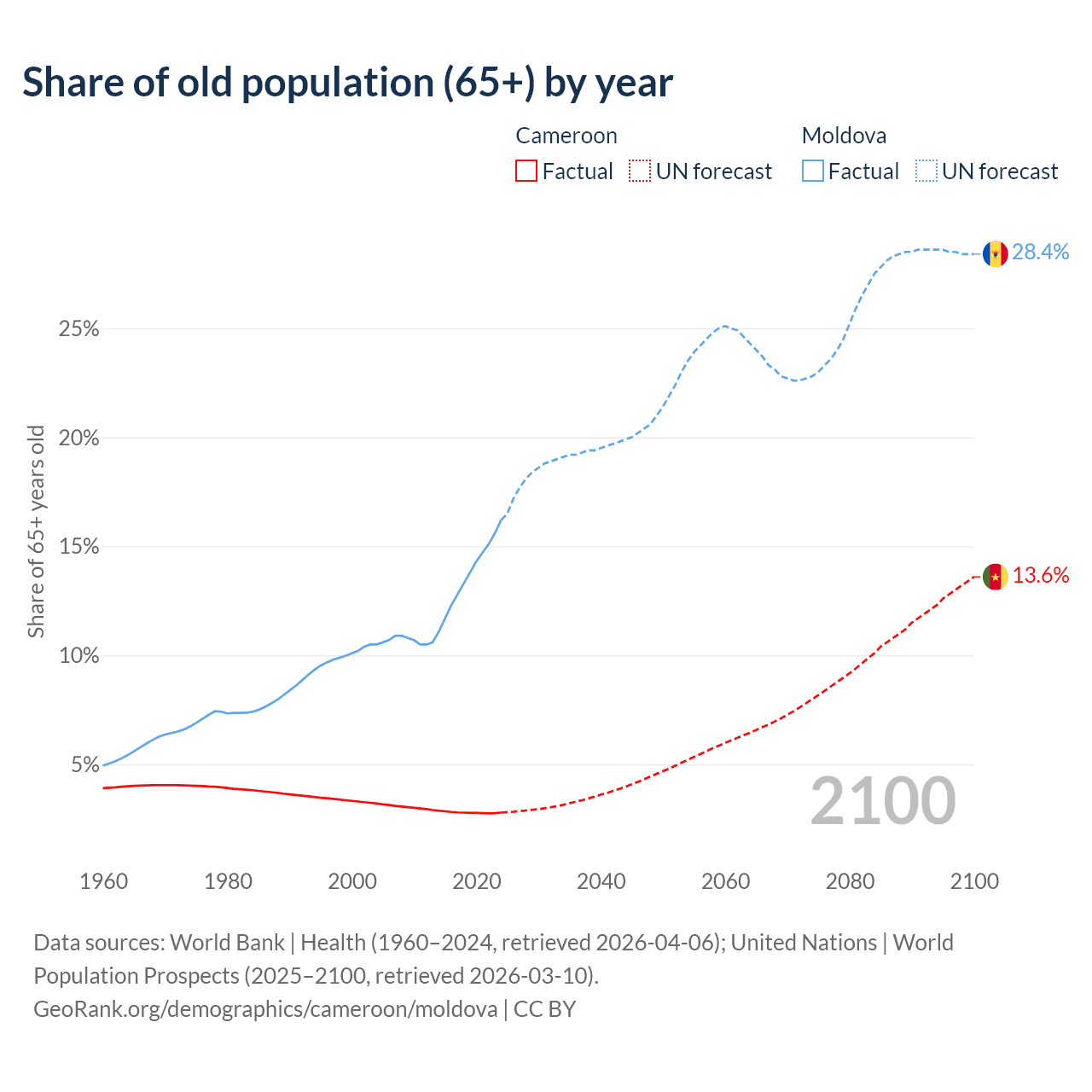 The share of older people aged 65 and over is 2.79% in Cameroon and 16.2% in Moldova. Life expectancy in Cameroon compared to Moldova .