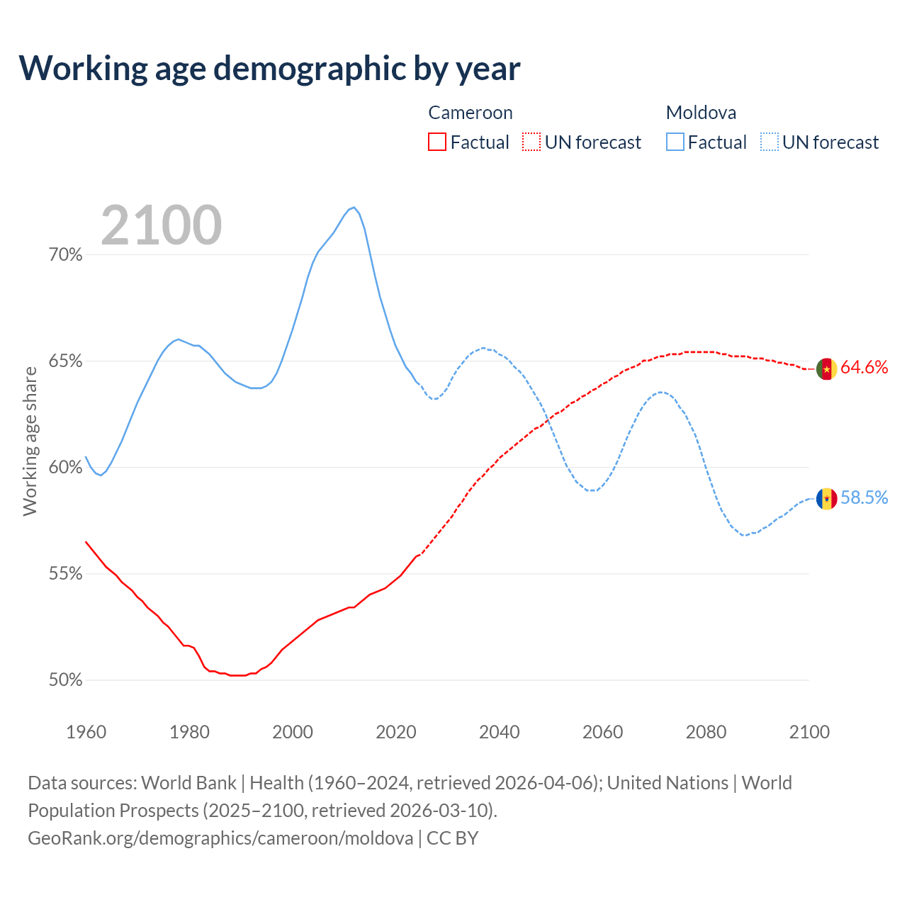 - Cameroon has 17.2M working age adults (aged 15-64) vs 1.5M in Moldova.