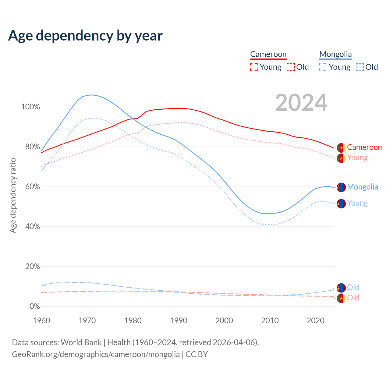 - Cameroon is ranked 180/196 by median age (oldest to youngest) vs 117/196 for Mongolia.