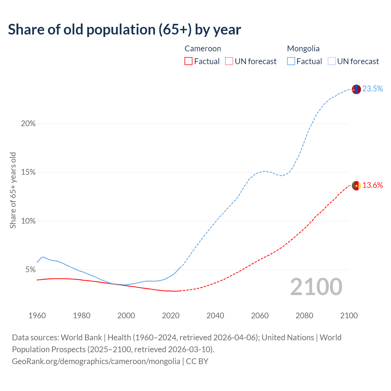 The share of older people aged 65 and over is 2.79% in Cameroon and 5.14% in Mongolia. Life expectancy in Cameroon compared to Mongolia .