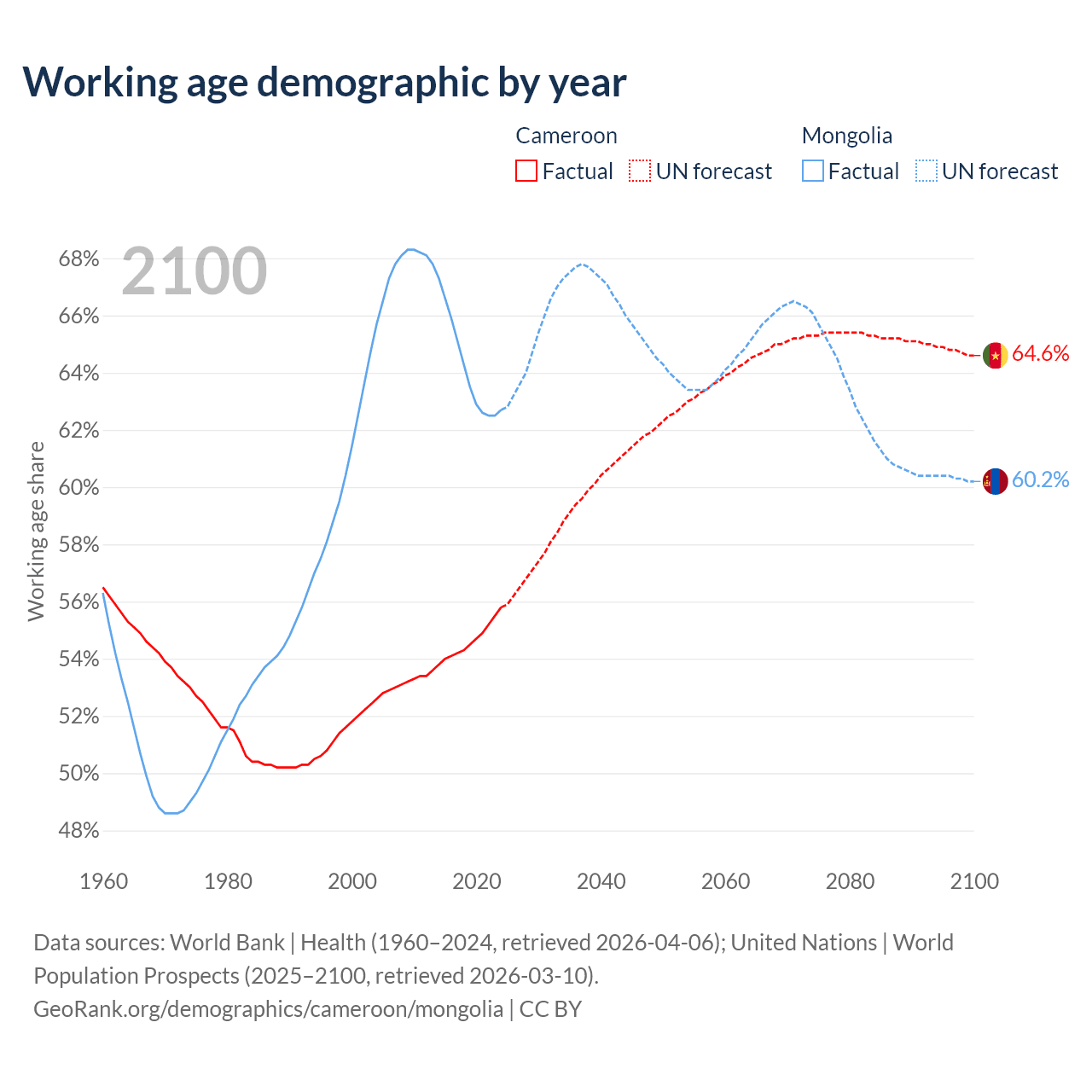 - Cameroon has 17.2M working age adults (aged 15-64) vs 2.27M in Mongolia.