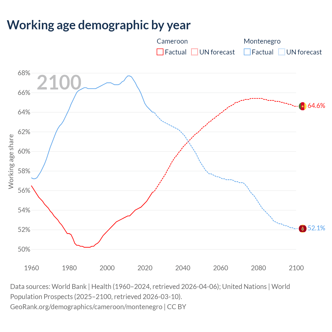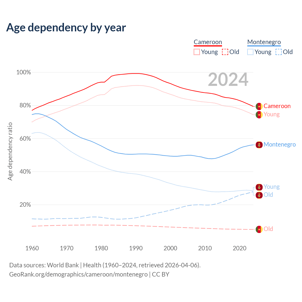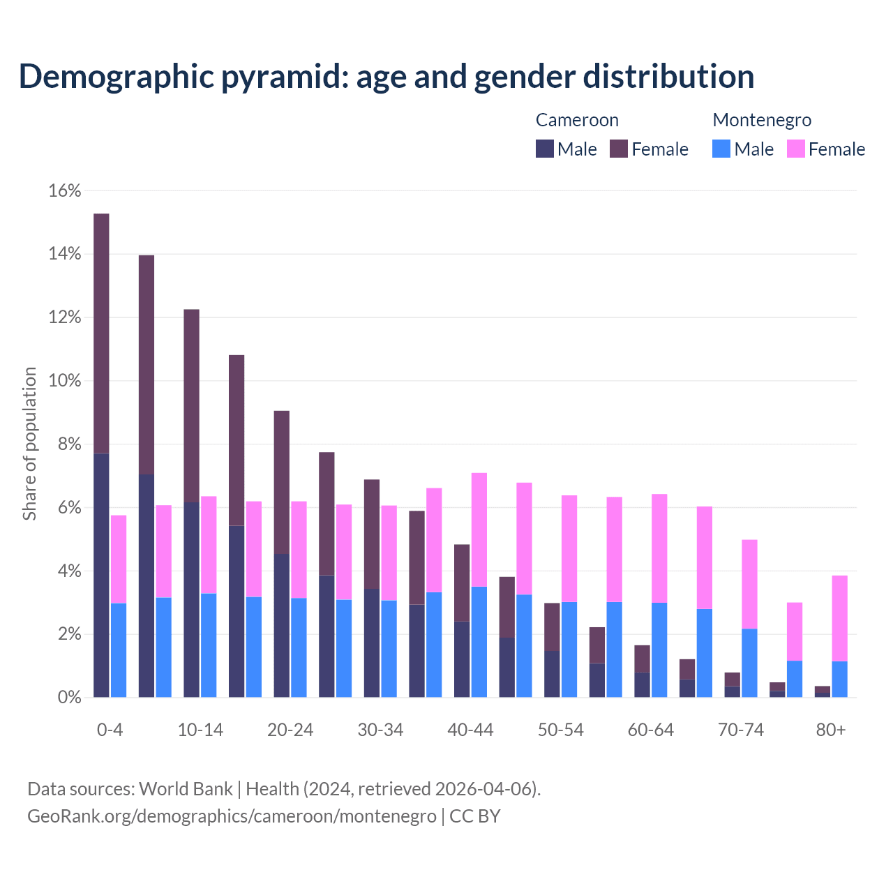 The share of older people aged 65 and over is 2.79% in Cameroon and 17.8% in Montenegro. Life expectancy in Cameroon compared to Montenegro .