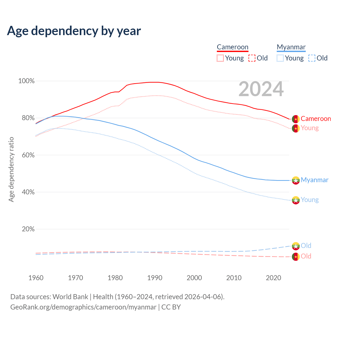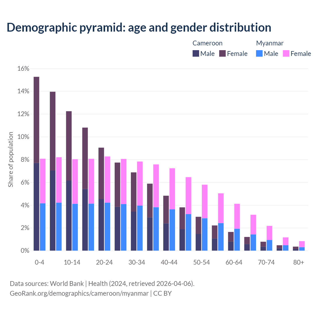- Cameroon is ranked 180/196 by median age (oldest to youngest) vs 96/196 for Myanmar.