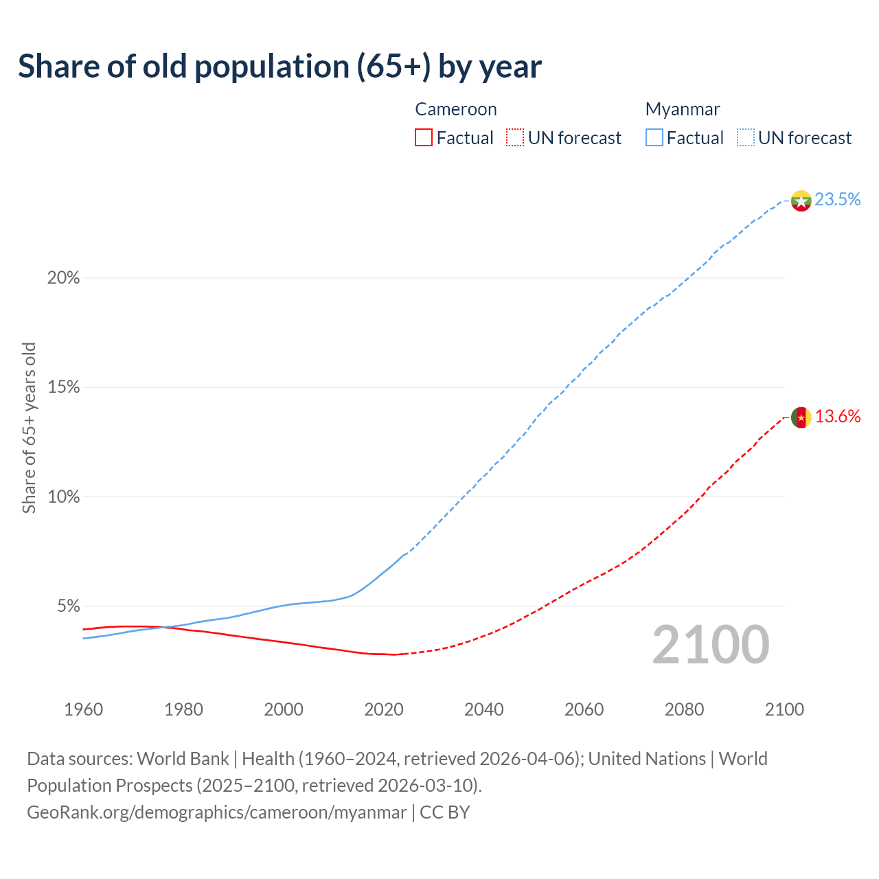 The share of older people aged 65 and over is 2.79% in Cameroon and 7.3% in Myanmar. Life expectancy in Cameroon compared to Myanmar .