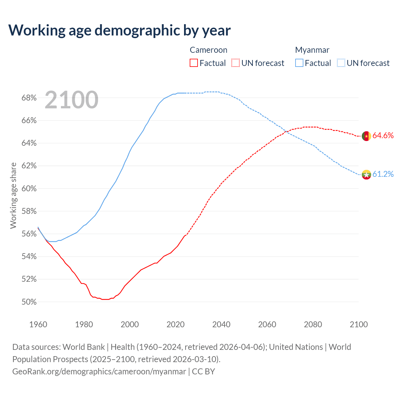 - Cameroon has 17.2M working age adults (aged 15-64) vs 37.8M in Myanmar.