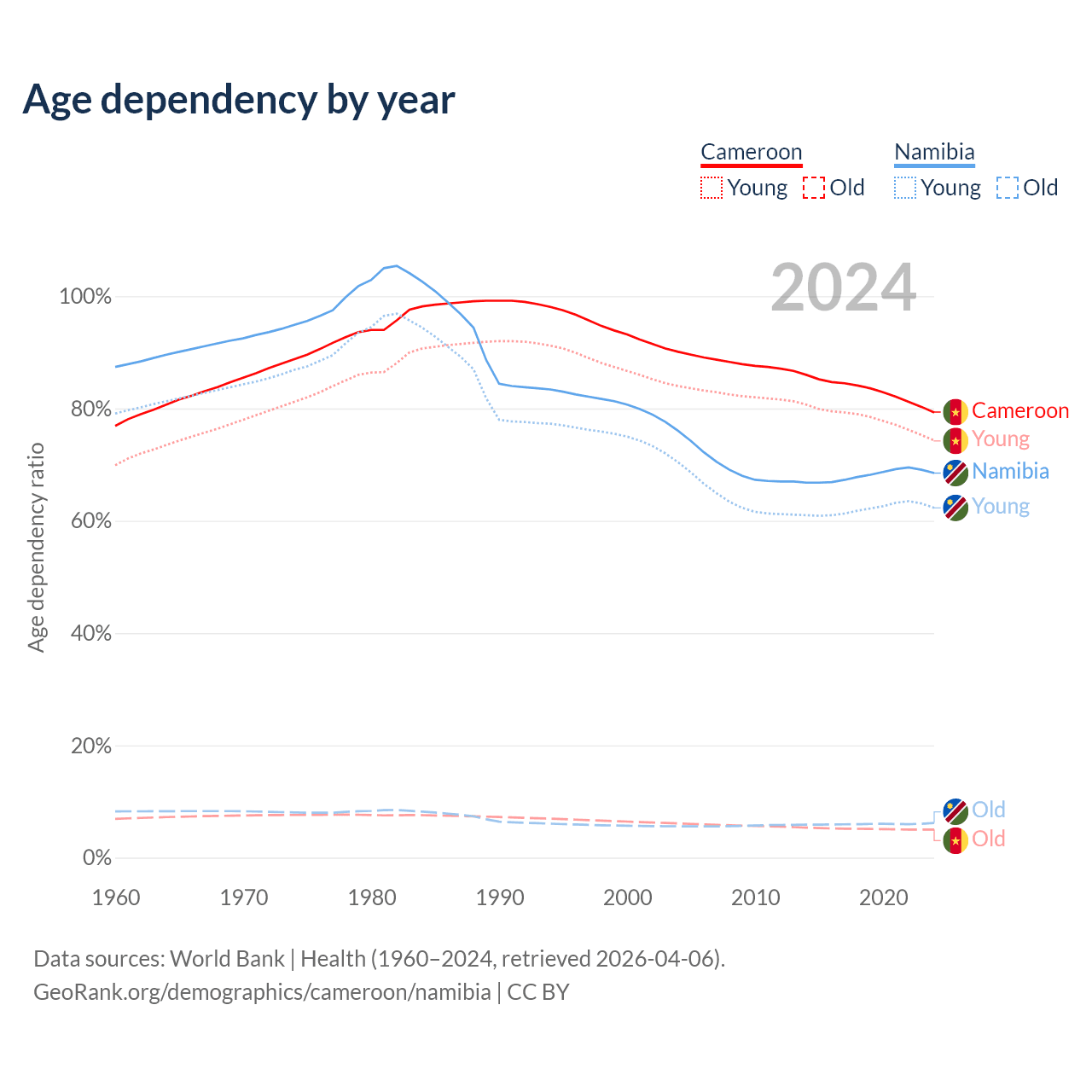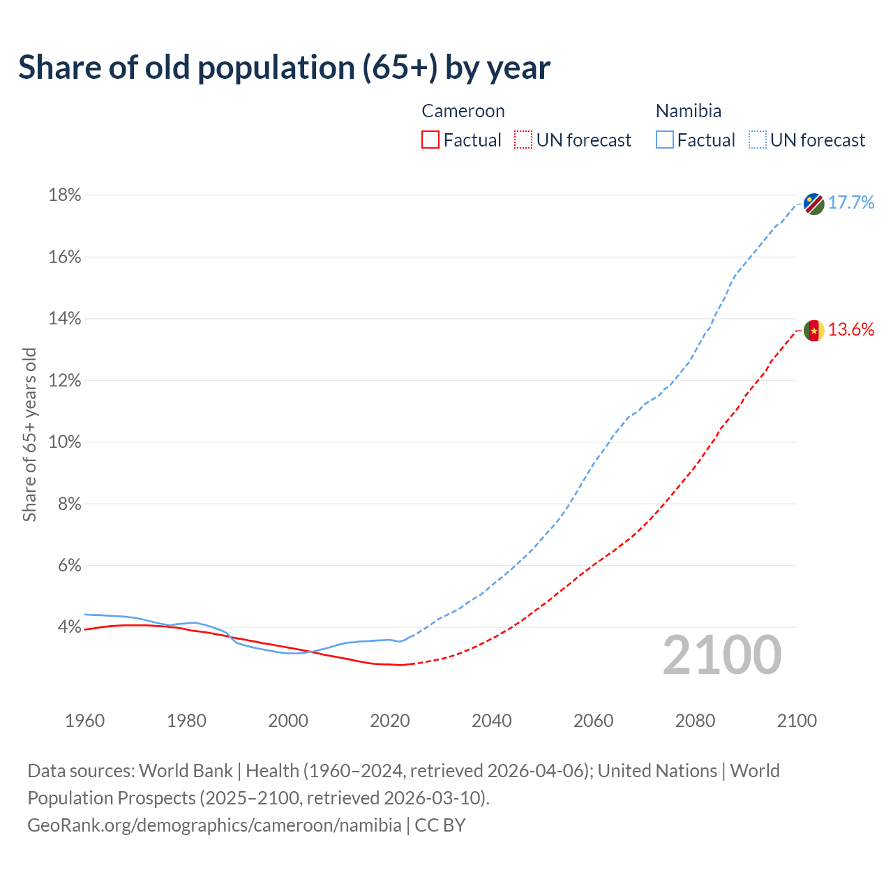 The share of older people aged 65 and over is 2.79% in Cameroon and 3.67% in Namibia. Life expectancy in Cameroon compared to Namibia .