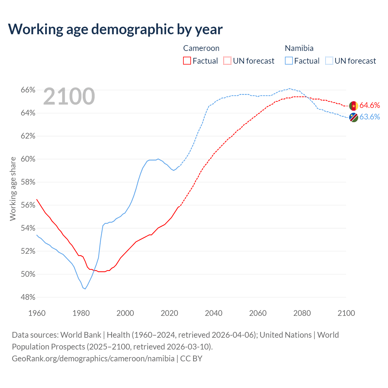 - Cameroon has 17.2M working age adults (aged 15-64) vs 1.88M in Namibia.