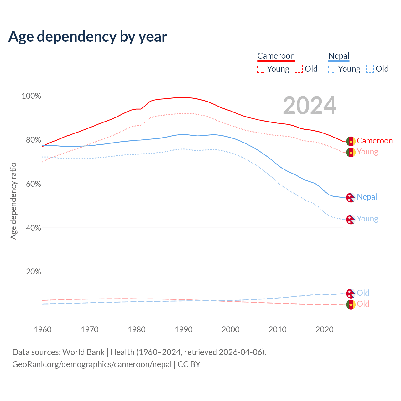 - Cameroon is ranked 180/196 by median age (oldest to youngest) vs 127/196 for Nepal.