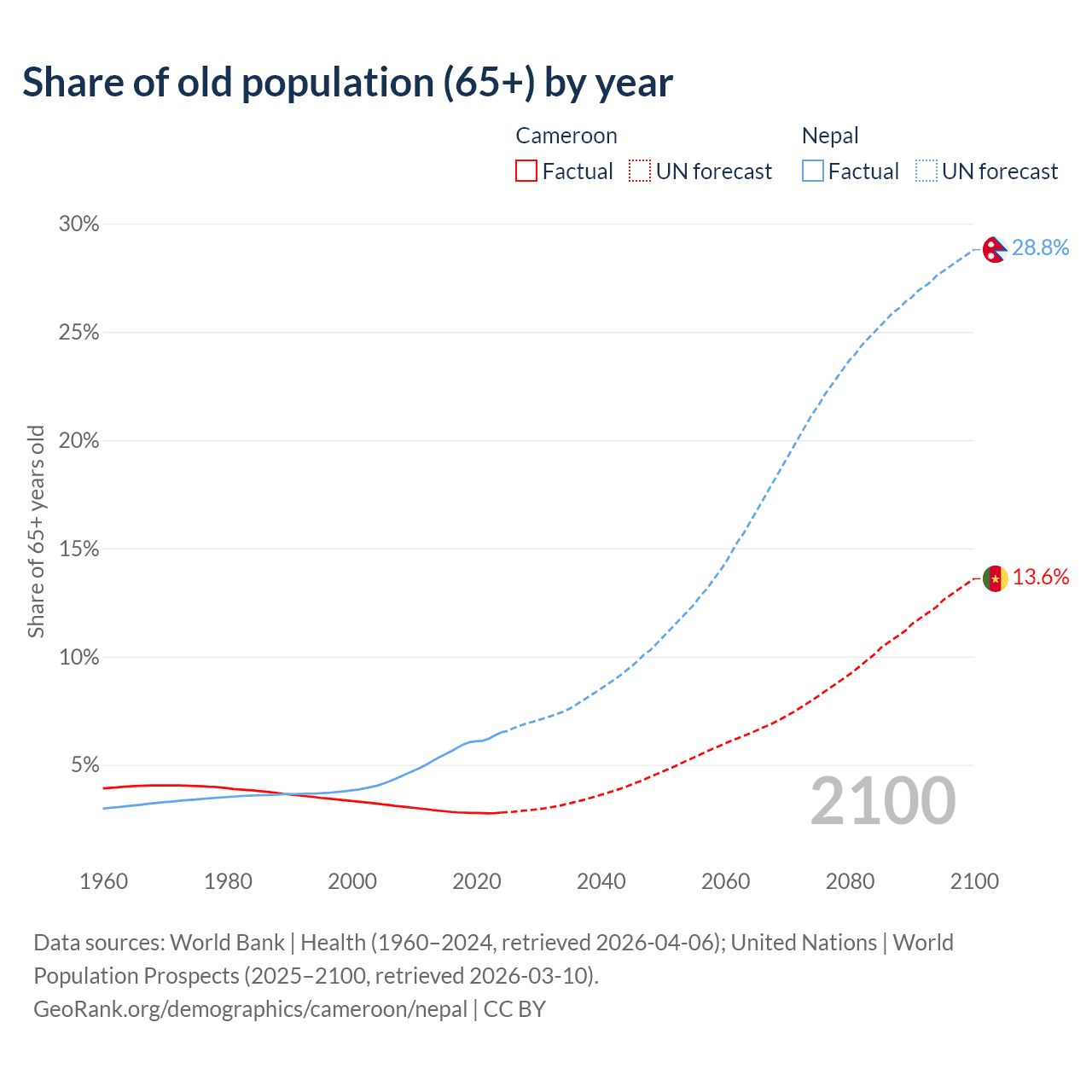 The share of older people aged 65 and over is 2.79% in Cameroon and 6.5% in Nepal. Life expectancy in Cameroon compared to Nepal .