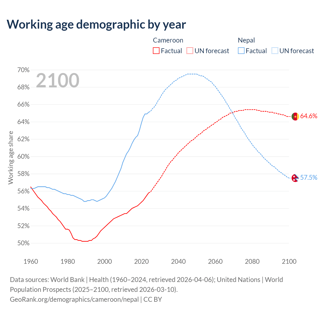 - Cameroon has 17.2M working age adults (aged 15-64) vs 19.3M in Nepal.