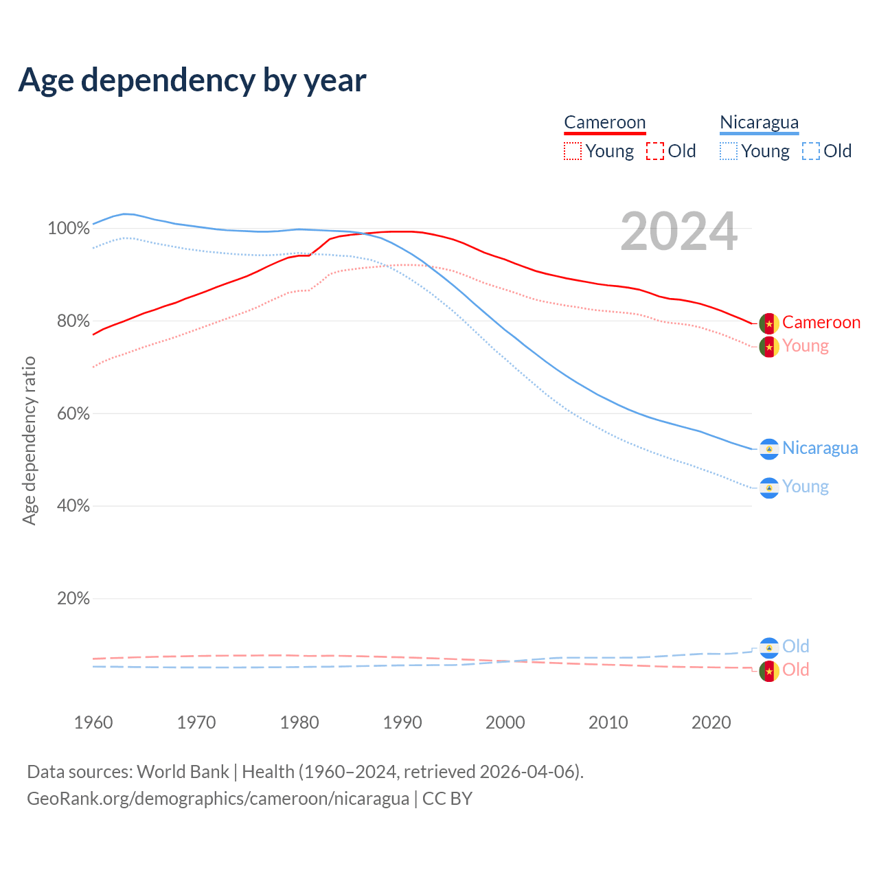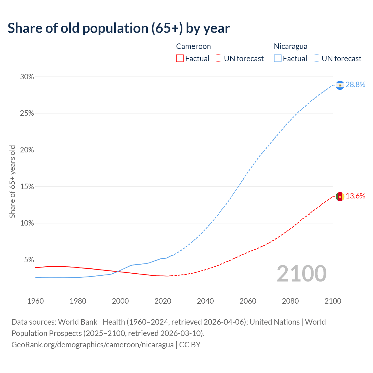 The share of older people aged 65 and over is 2.79% in Cameroon and 5.53% in Nicaragua. Life expectancy in Cameroon compared to Nicaragua .