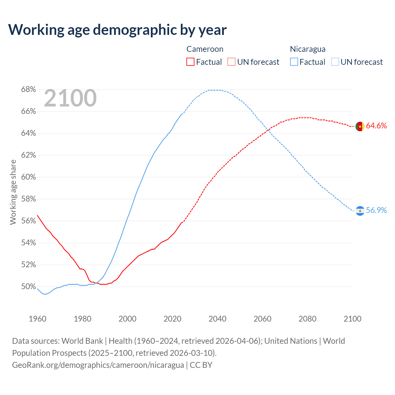 - Cameroon has 17.2M working age adults (aged 15-64) vs 4.68M in Nicaragua.