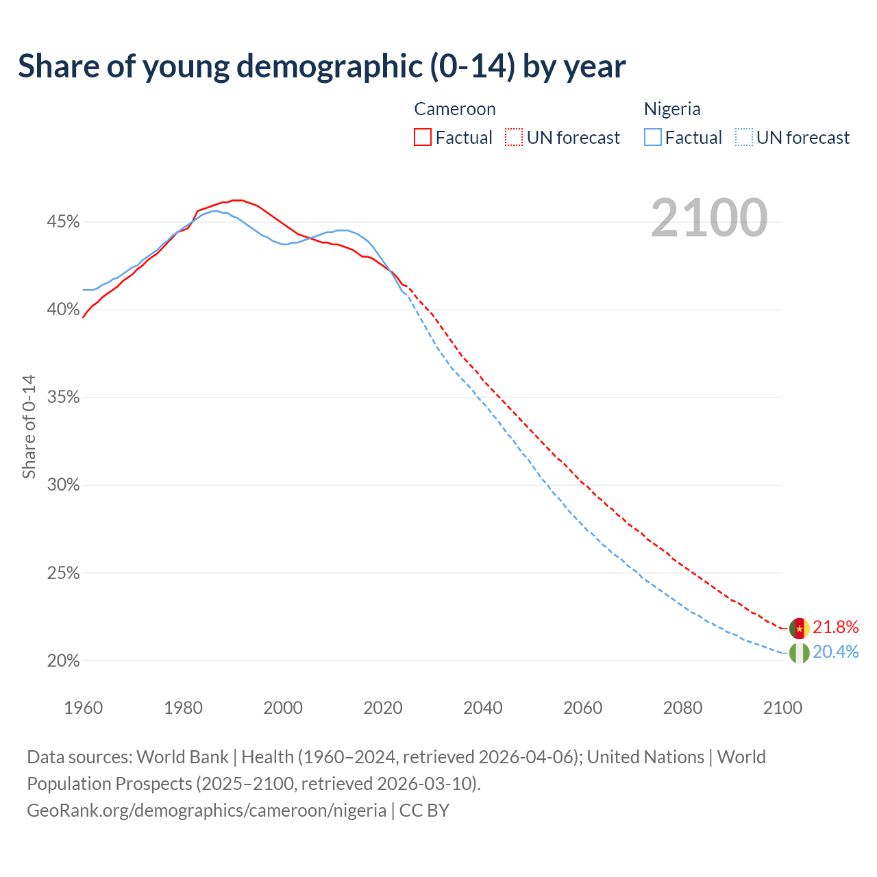 - The share of young demographic (0-15 years old) in Cameroon is 41.4% vs 41% in Nigeria.