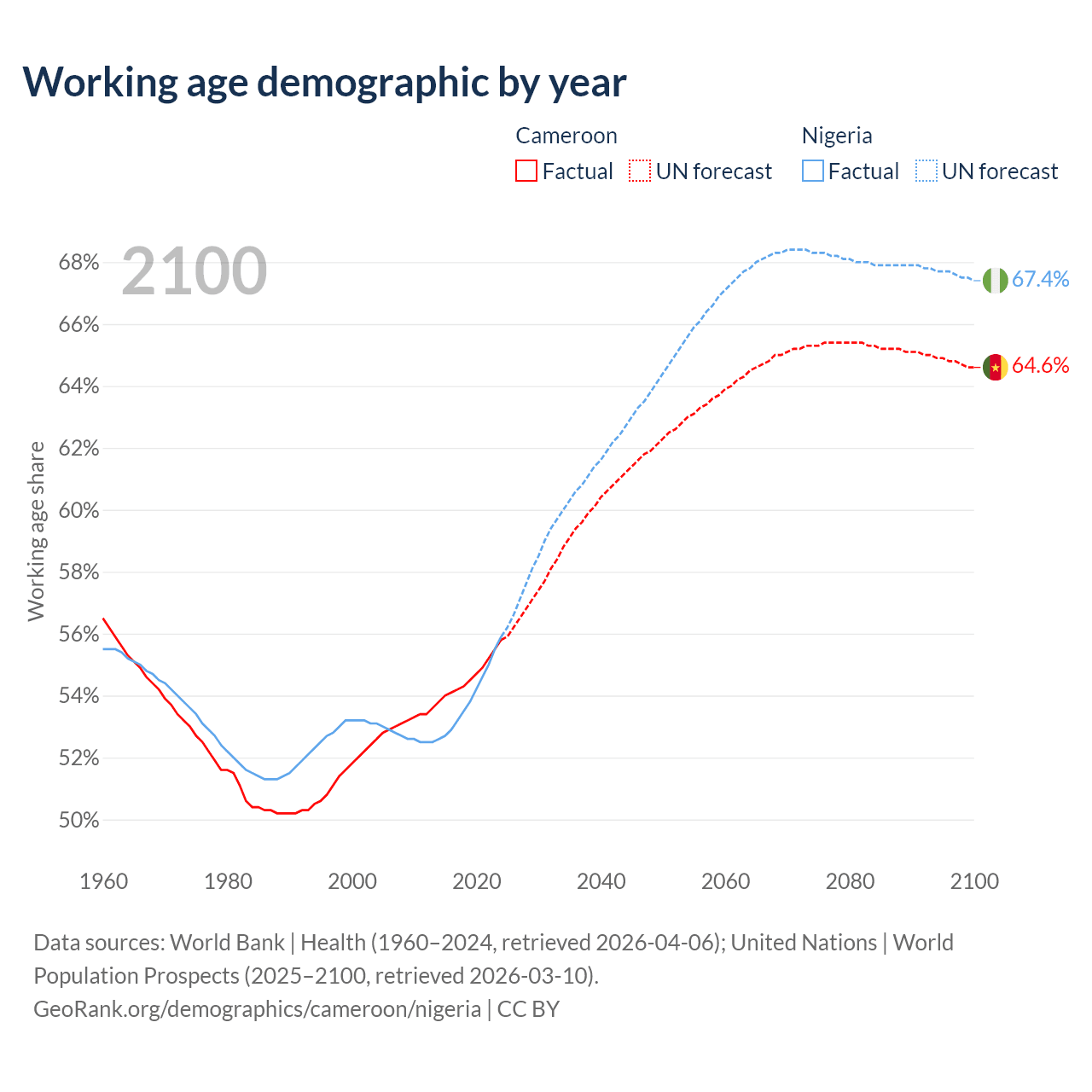 - Cameroon has 17.2M working age adults (aged 15-64) vs 136M in Nigeria.