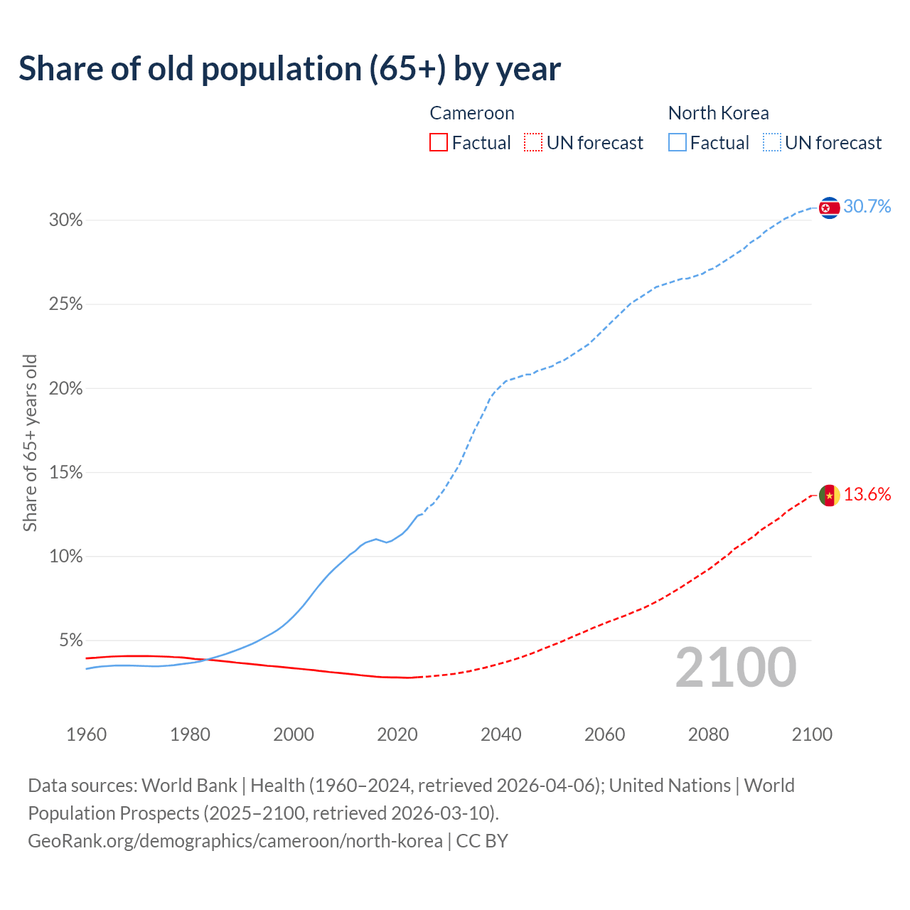 The share of older people aged 65 and over is 2.79% in Cameroon and 12.4% in North Korea. Life expectancy in Cameroon compared to North Korea .