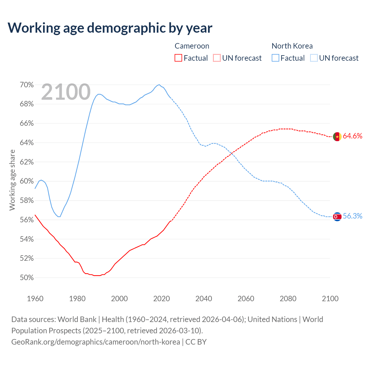 - Cameroon has 17.2M working age adults (aged 15-64) vs 18.3M in North Korea.