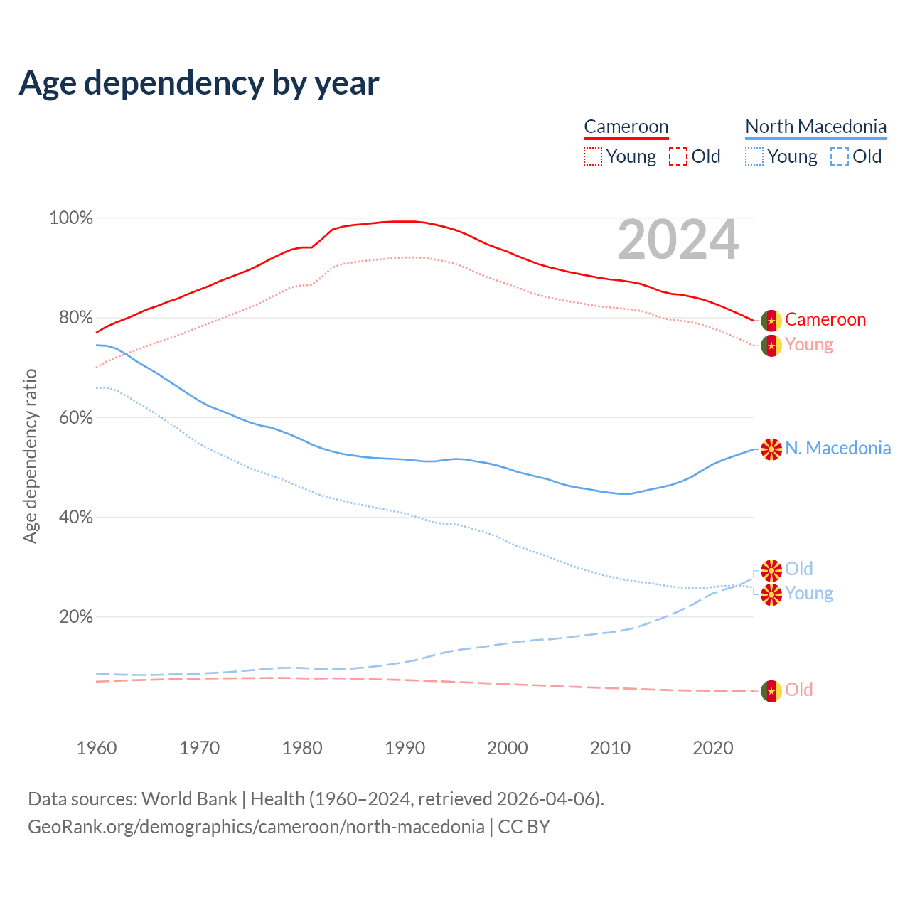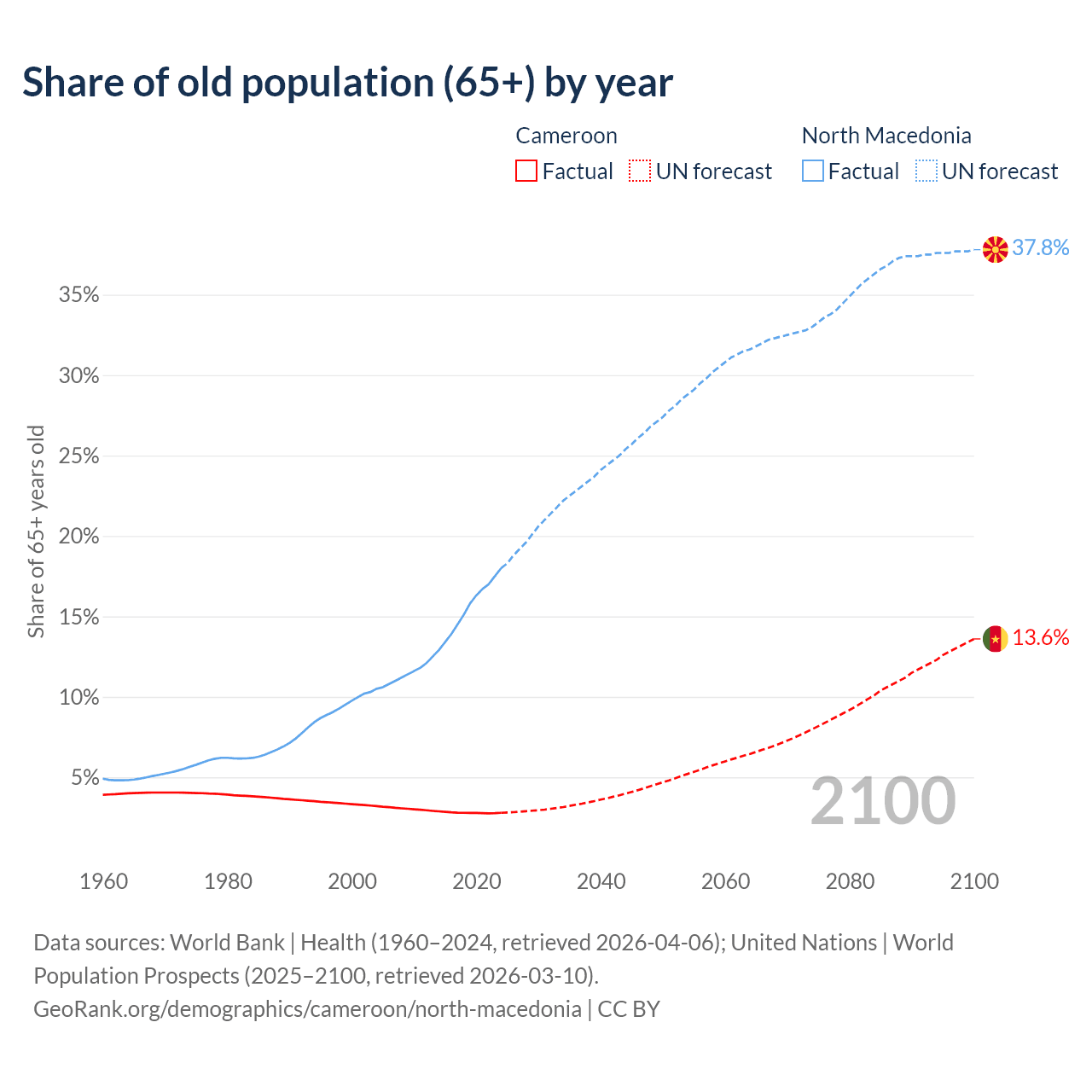 The share of older people aged 65 and over is 2.79% in Cameroon and 18% in North Macedonia. Life expectancy in Cameroon compared to North Macedonia .