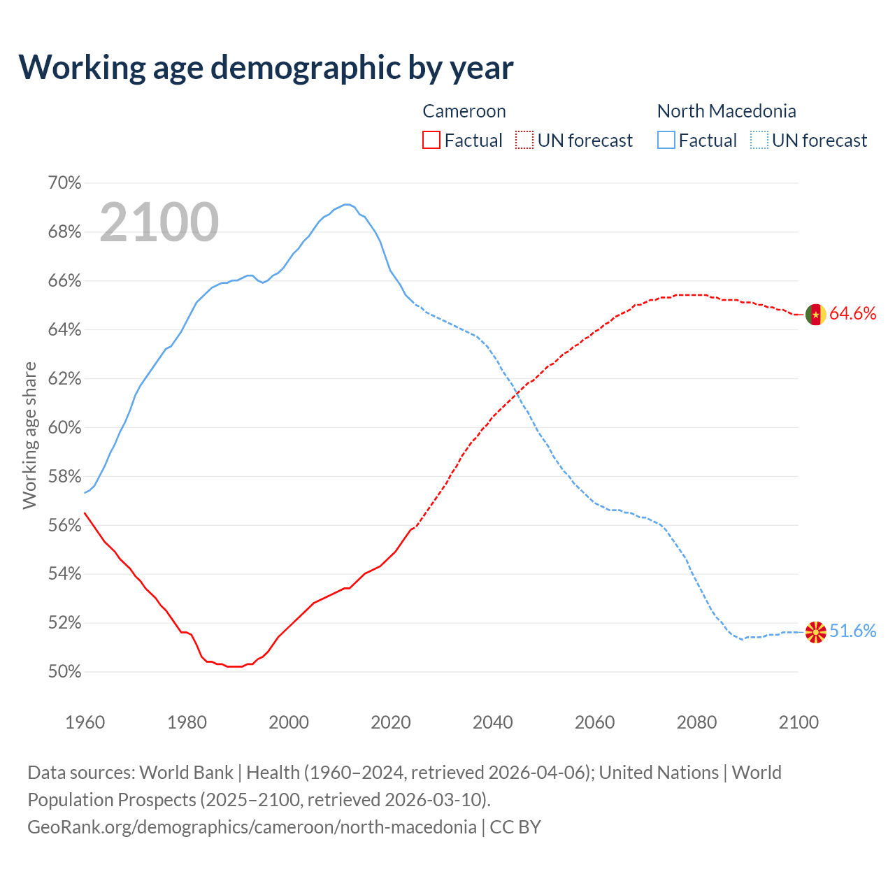 - Cameroon has 17.2M working age adults (aged 15-64) vs 1.18M in North Macedonia.