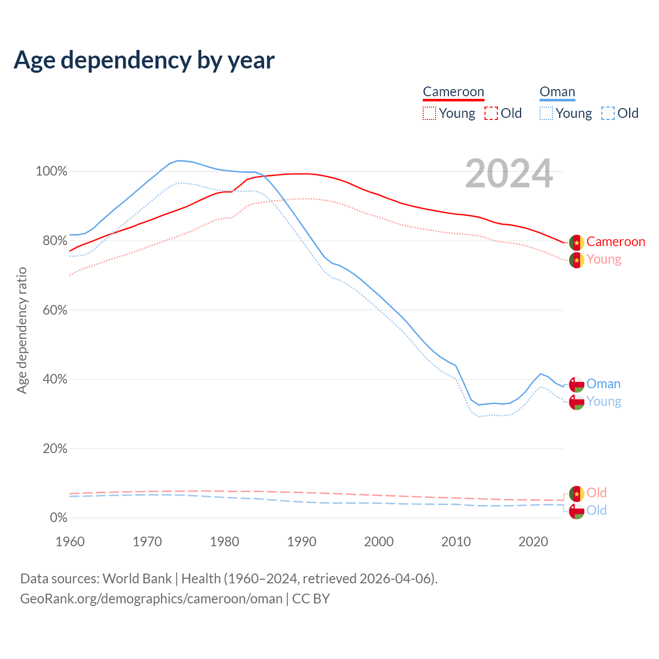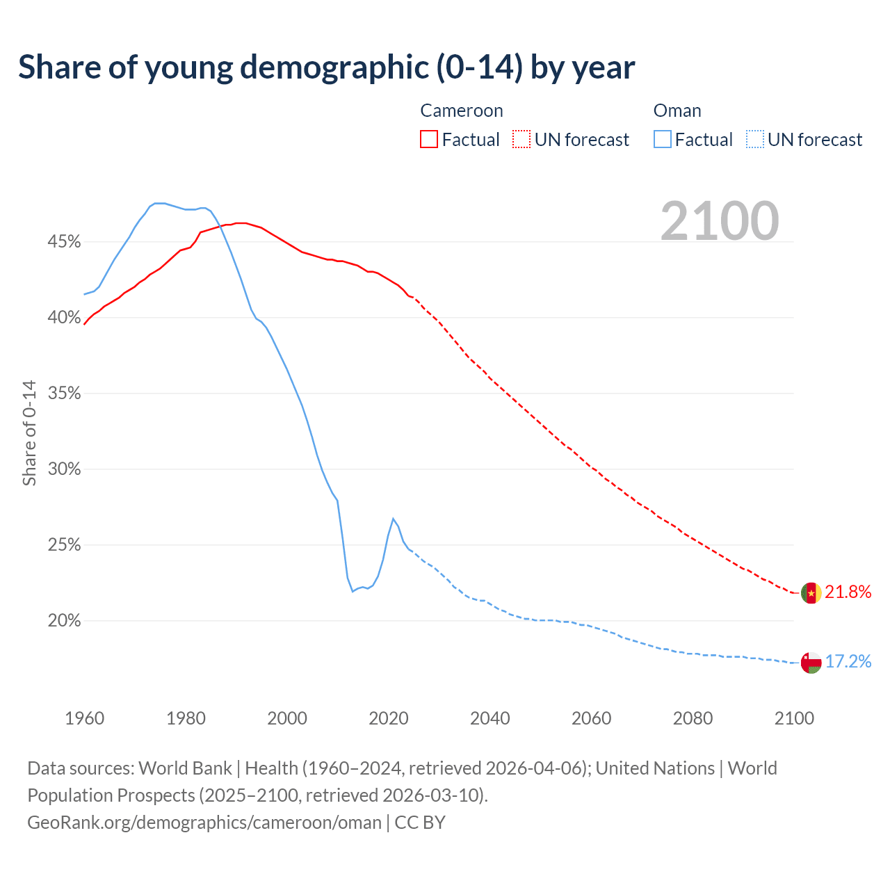 - The share of young demographic (0-15 years old) in Cameroon is 41.4% vs 24.7% in Oman.