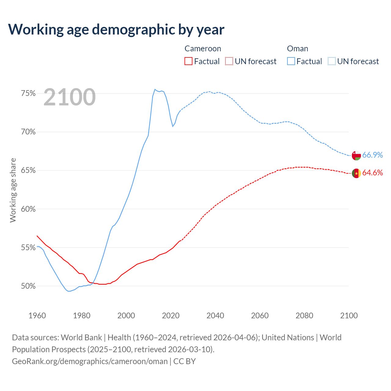 - Cameroon has 17.2M working age adults (aged 15-64) vs 4.19M in Oman.
