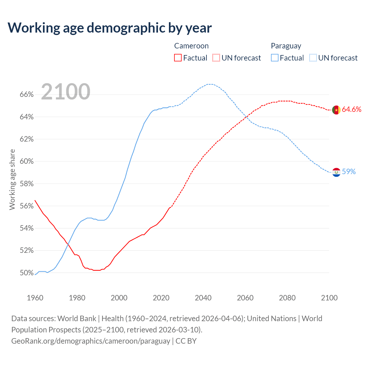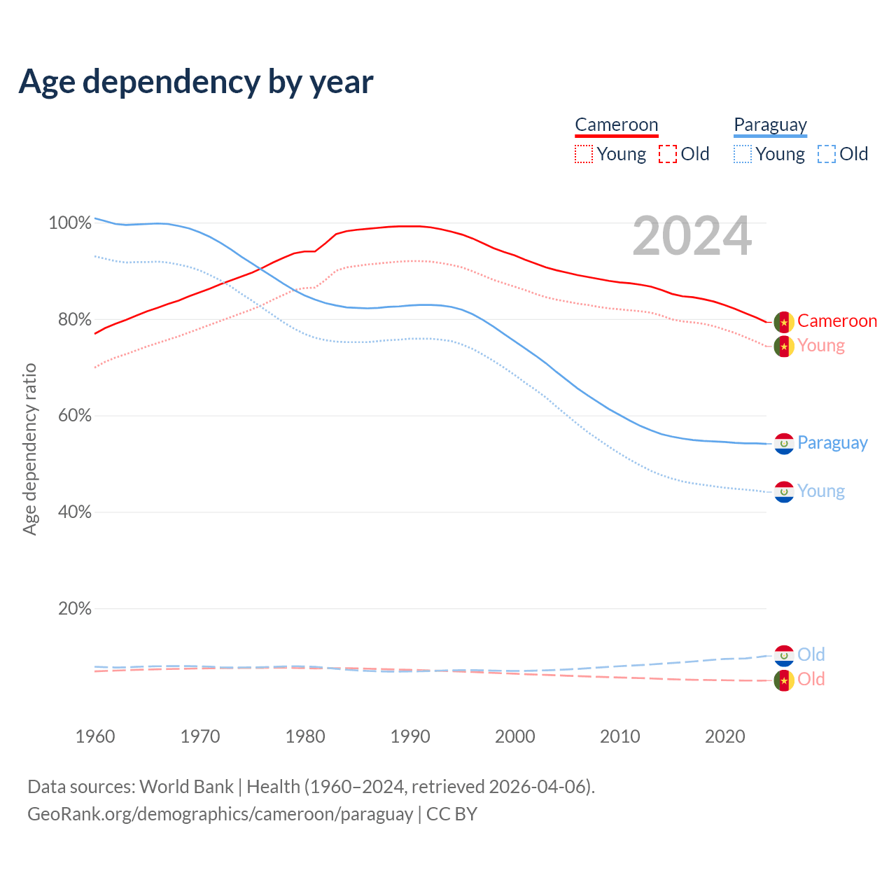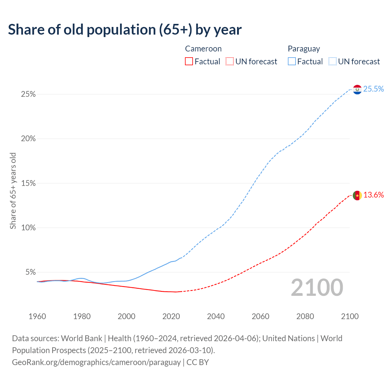The share of older people aged 65 and over is 2.79% in Cameroon and 6.54% in Paraguay. Life expectancy in Cameroon compared to Paraguay .