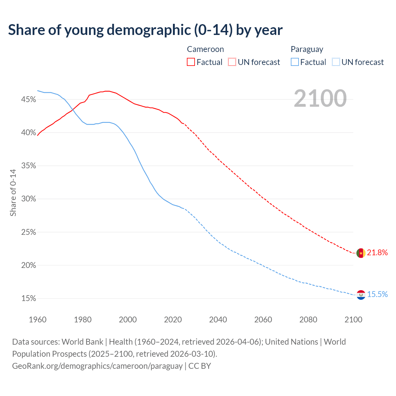 - The share of young demographic (0-15 years old) in Cameroon is 41.4% vs 28.6% in Paraguay.