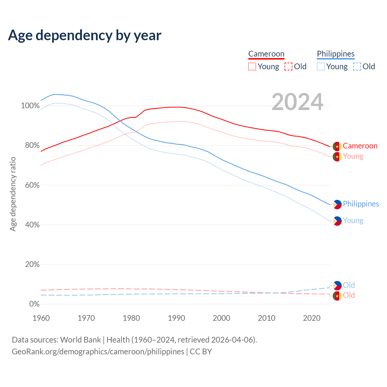 The share of older people aged 65 and over is 2.79% in Cameroon and 5.49% in the Philippines. Life expectancy in Cameroon compared to the Philippines .