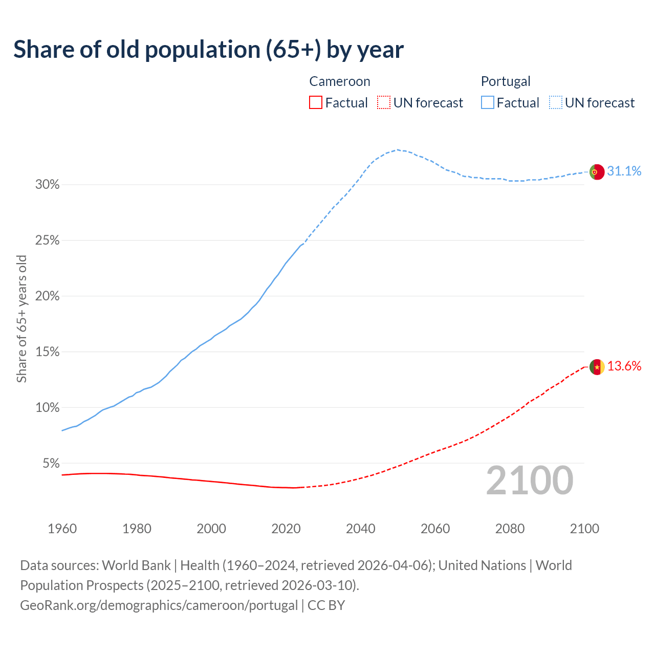 The share of older people aged 65 and over is 2.79% in Cameroon and 24.5% in Portugal. Life expectancy in Cameroon compared to Portugal .
