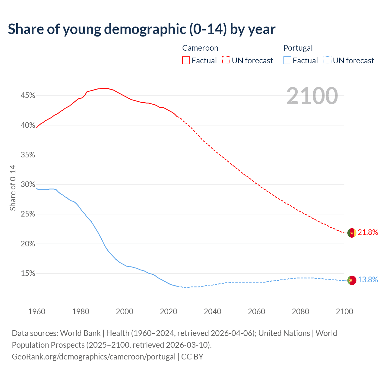 - The share of young demographic (0-15 years old) in Cameroon is 41.4% vs 12.8% in Portugal.