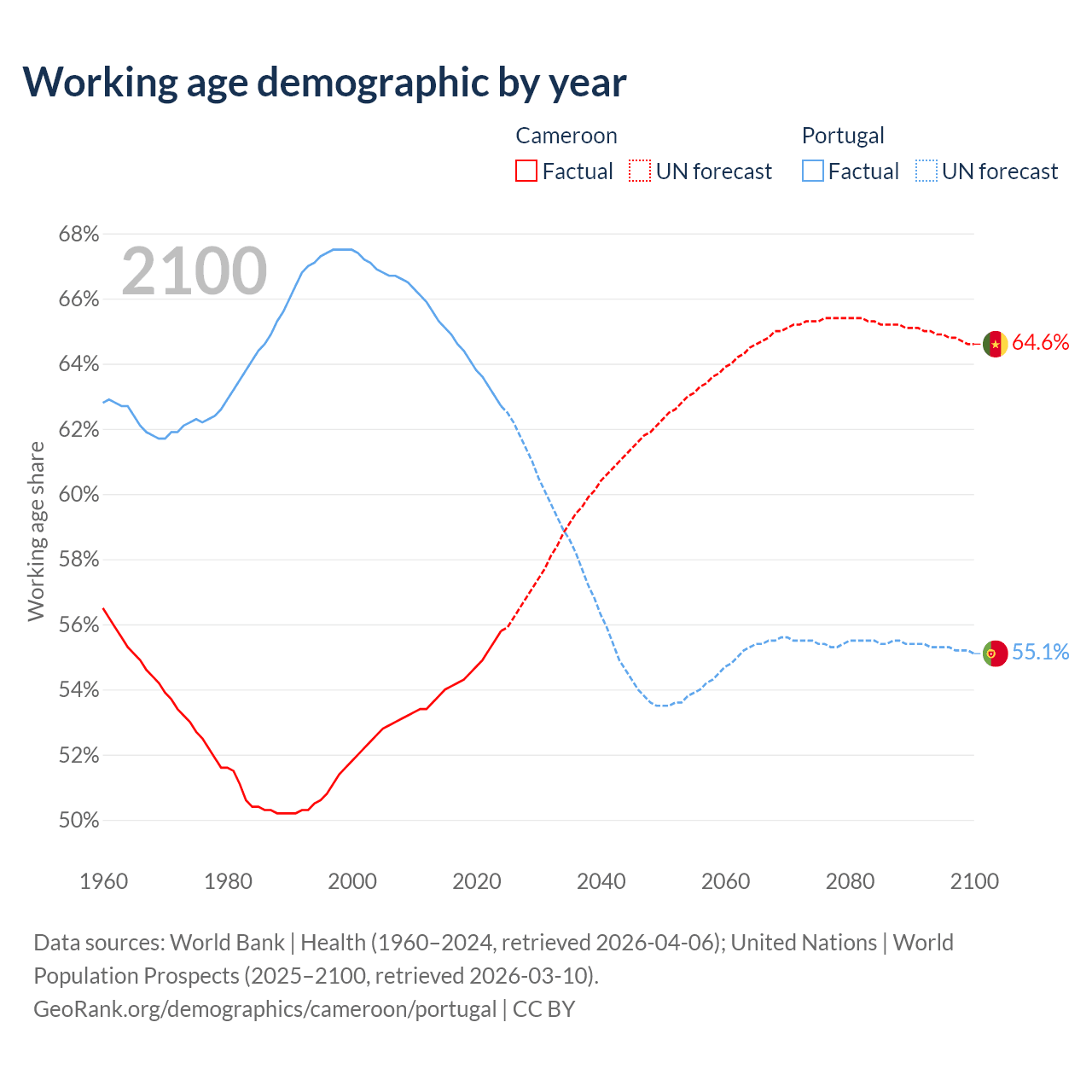 - Cameroon has 17.2M working age adults (aged 15-64) vs 6.68M in Portugal.