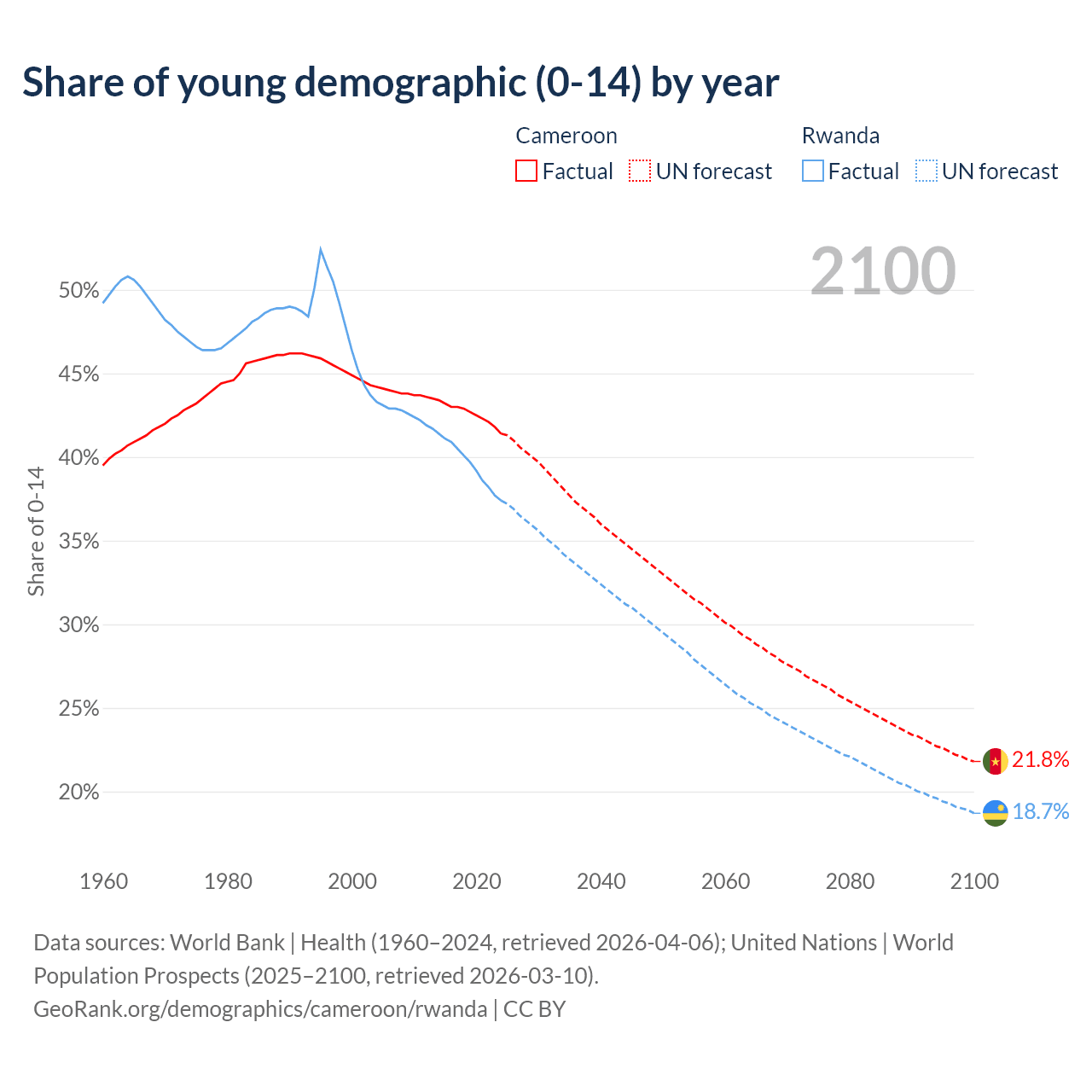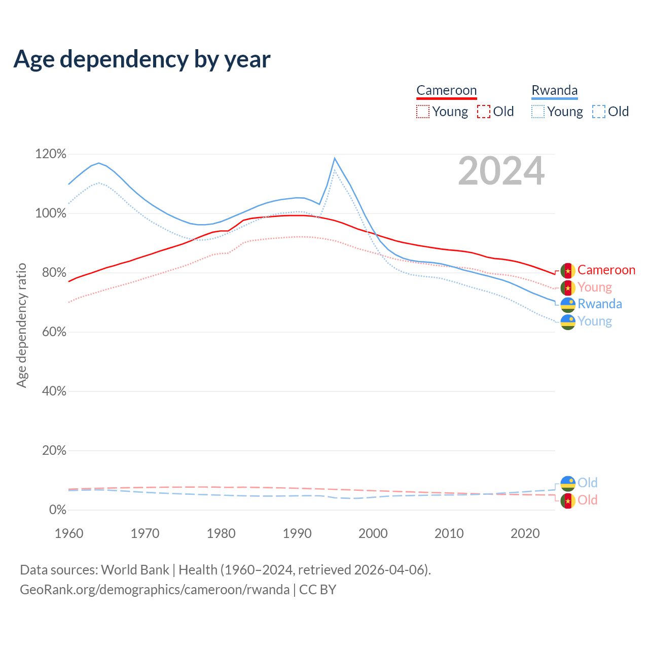 - Cameroon is ranked 180/196 by median age (oldest to youngest) vs 160/196 for Rwanda.
