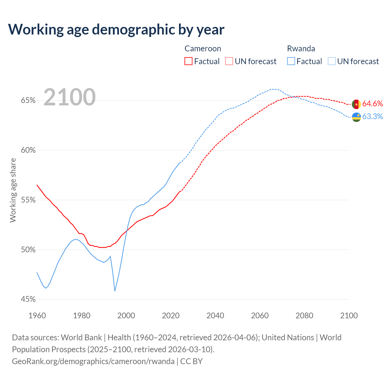 - Cameroon has 17.2M working age adults (aged 15-64) vs 8.79M in Rwanda.