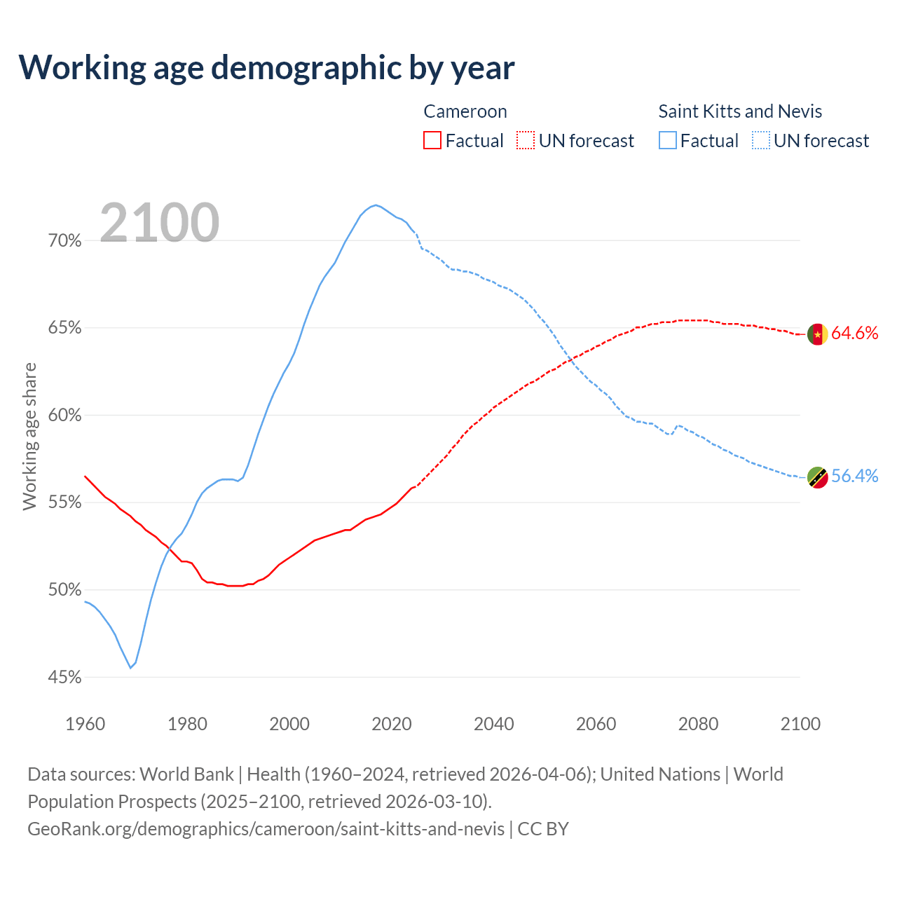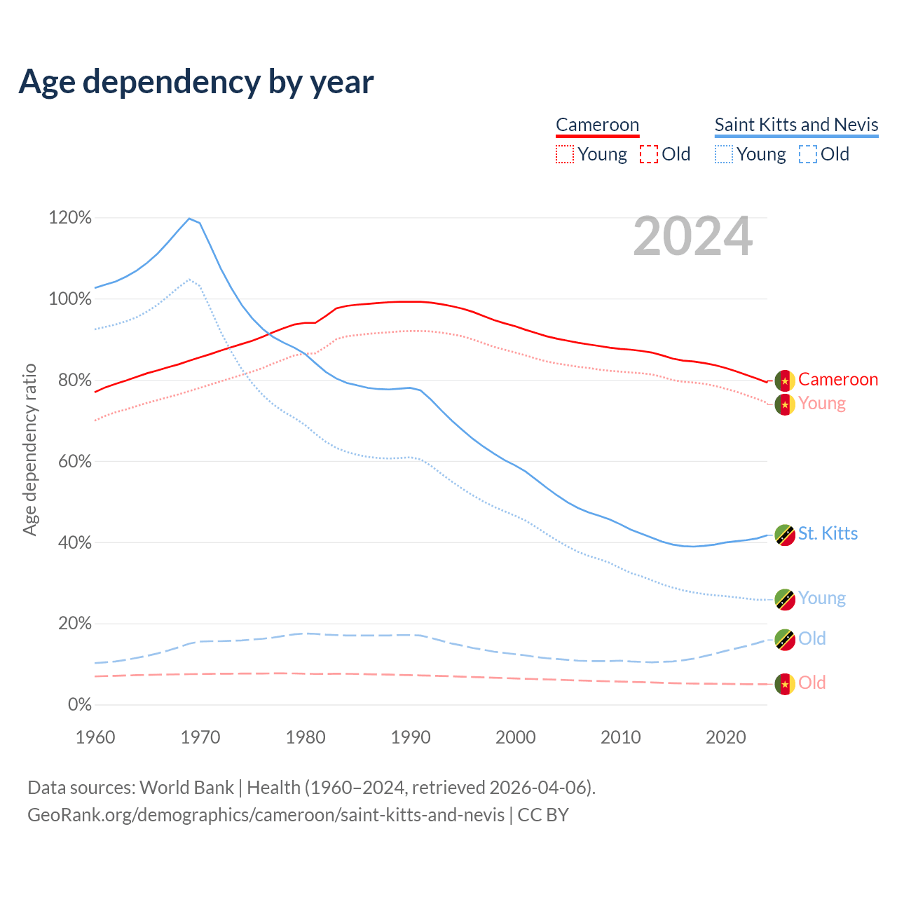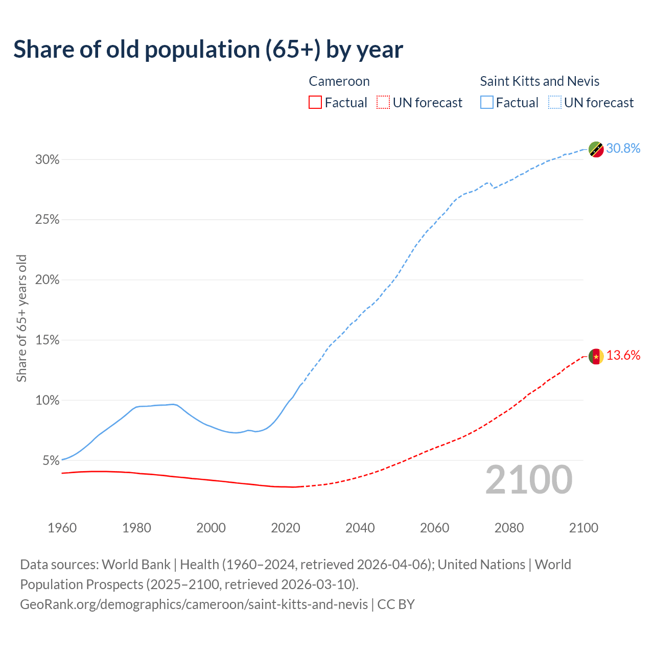 The share of older people aged 65 and over is 2.79% in Cameroon and 11.2% in Saint Kitts and Nevis. Life expectancy in Cameroon compared to Saint Kitts and Nevis .