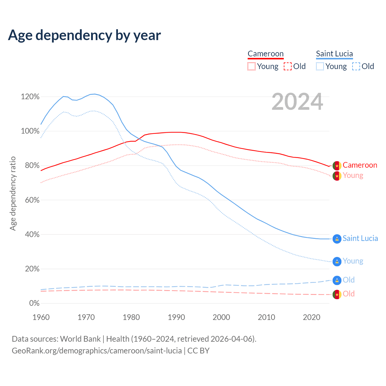 - The share of old-age demographic (65+) in Cameroon is 2.79% vs 9.62% in Saint Lucia.