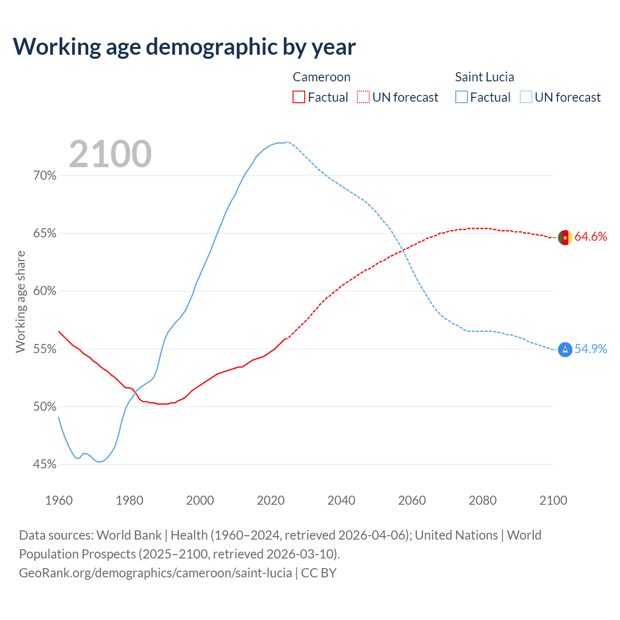 The share of older people aged 65 and over is 2.79% in Cameroon and 9.62% in Saint Lucia. Life expectancy in Cameroon compared to Saint Lucia .