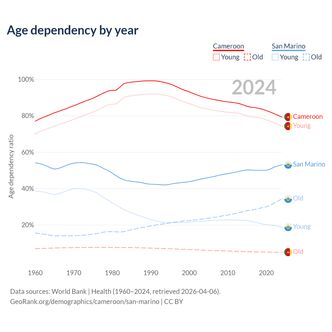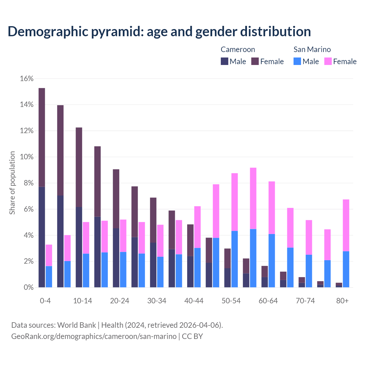 - Cameroon is ranked 180/196 by median age (oldest to youngest) vs 3/196 for San Marino.