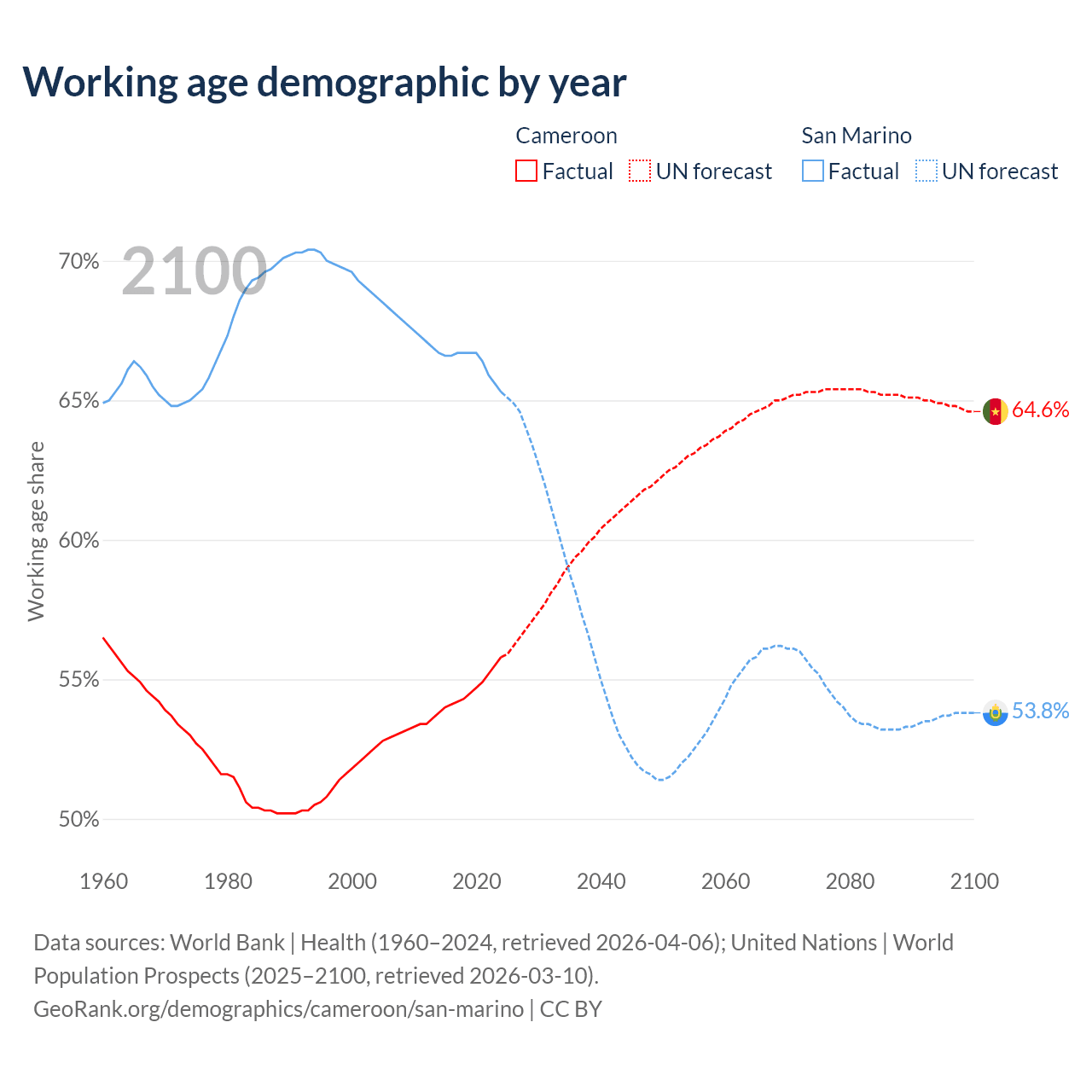 - Cameroon has 17.2M working age adults (aged 15-64) vs 22.2K in San Marino.